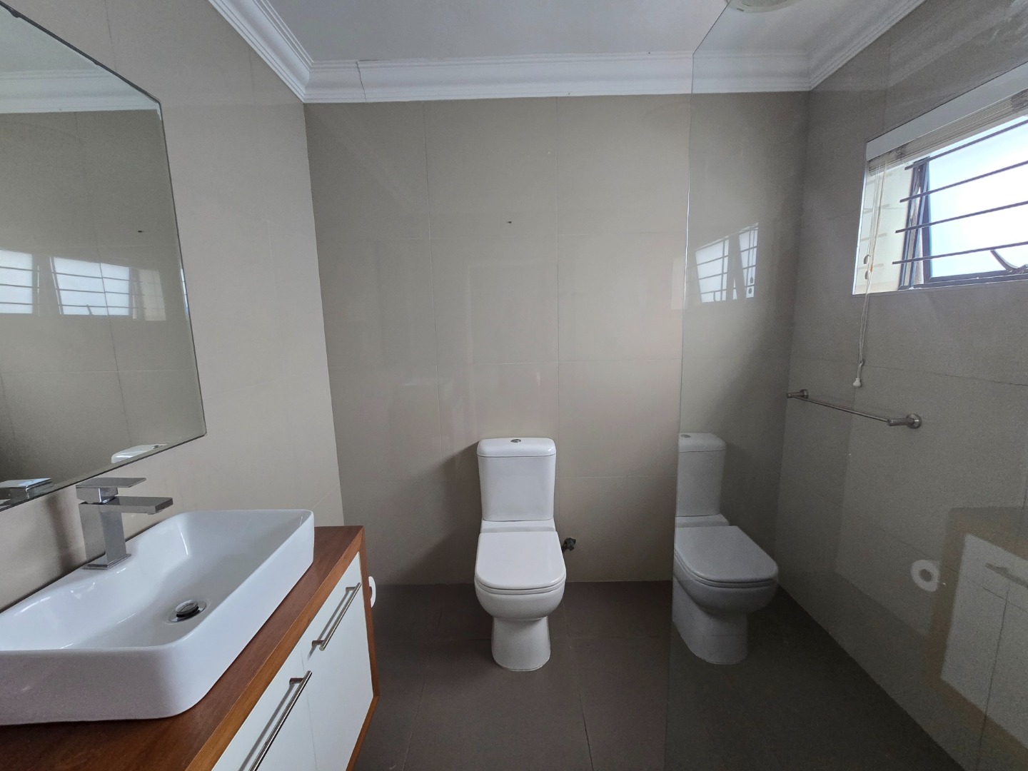 The main suite downstairs offers ample fitted cupboards and sliding doors opening up onto patio and pool – fitted with blinds. Lie in bed & enjoy the breathtaking vista’s – or close the shutters and be completely shut off from the world. The open en-suite offers a freestanding slipper bath, toilet, double vanity & walk-in shower.