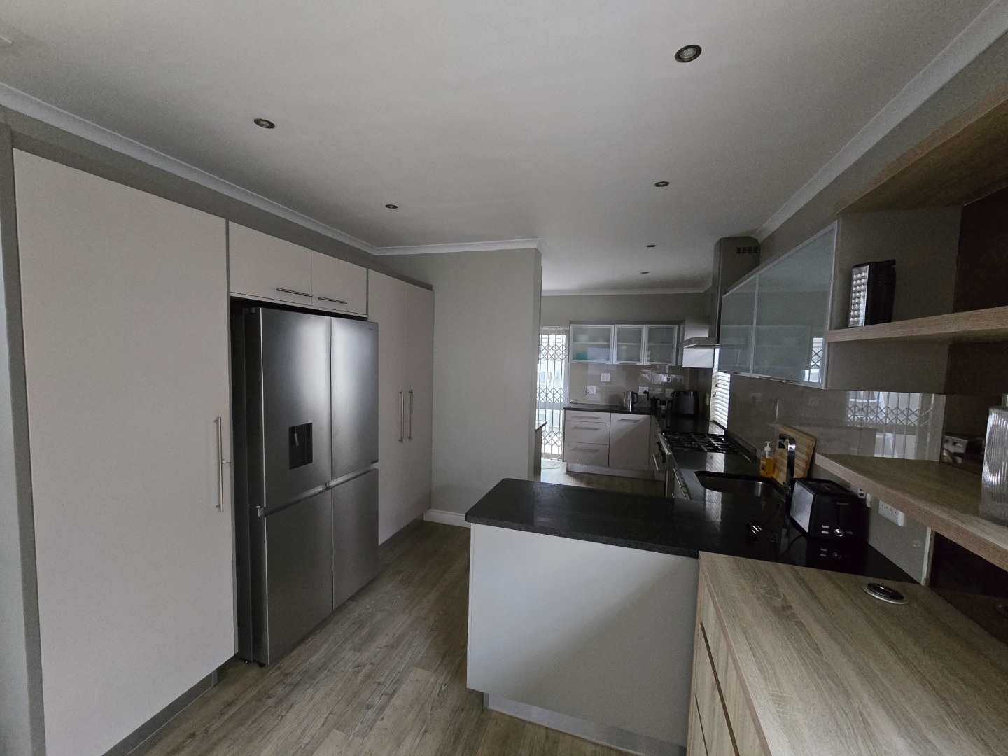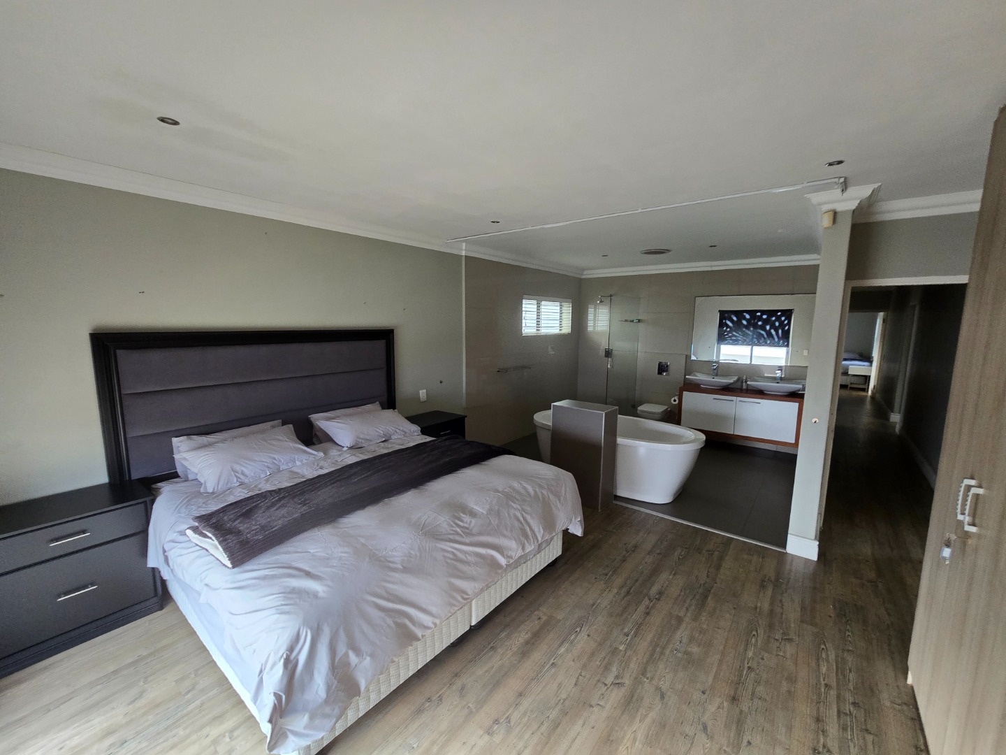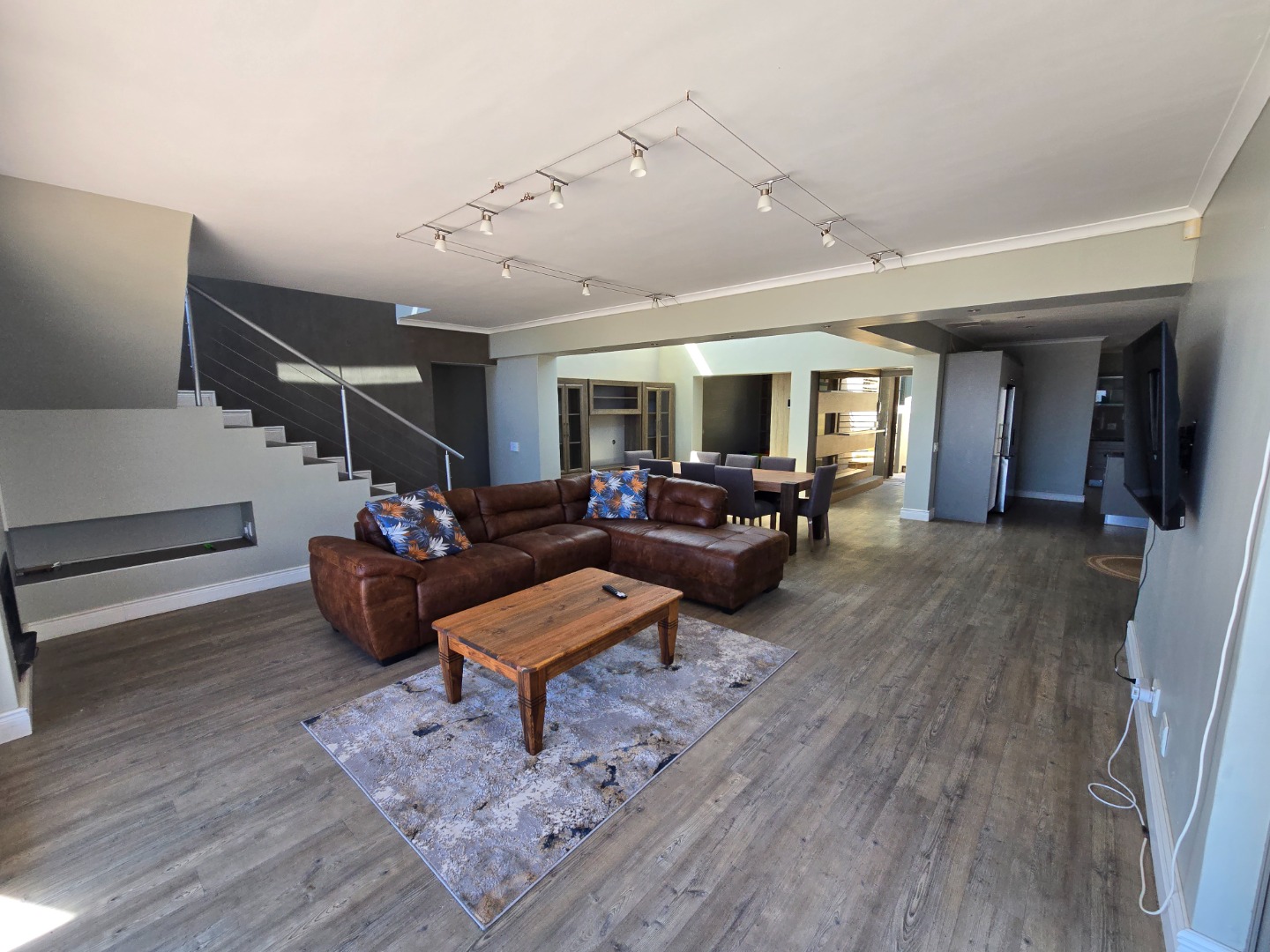 Modern bar open plan to expansive living area with stacking sliding doors opening up to the outside built-in braai area and sparkling pool. The lounge is spacious and open plan and fitted with a fireplace to warm the house on a chilly evening . The dining area offers double volume ceilings with windows, allowing the