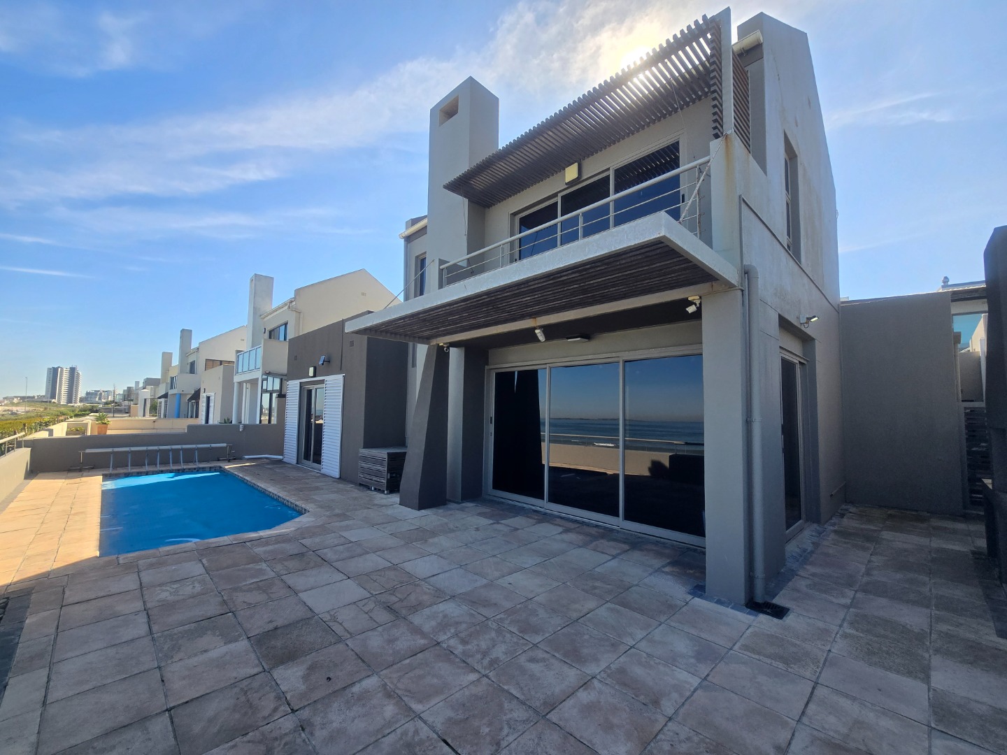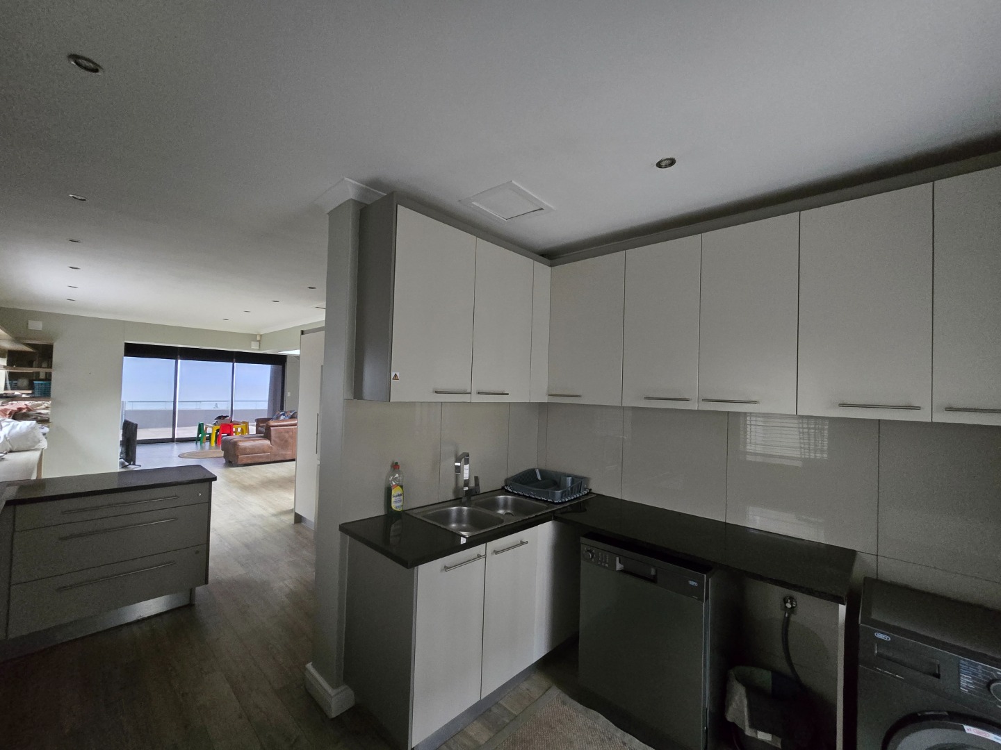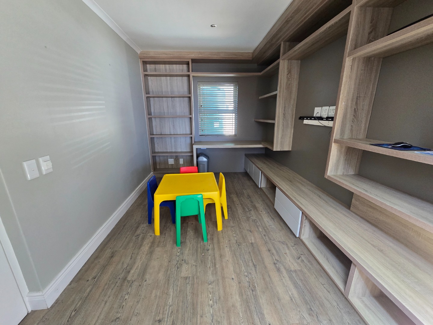 Modern bar open plan to expansive living area with stacking sliding doors opening up to the outside built-in braai area and sparkling pool. The lounge is spacious and open plan and fitted with a fireplace to warm the house on a chilly evening . The dining area offers double volume ceilings with windows, allowing the