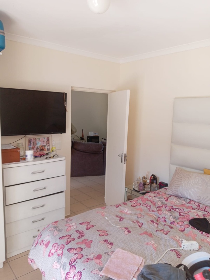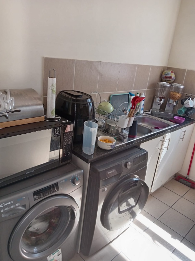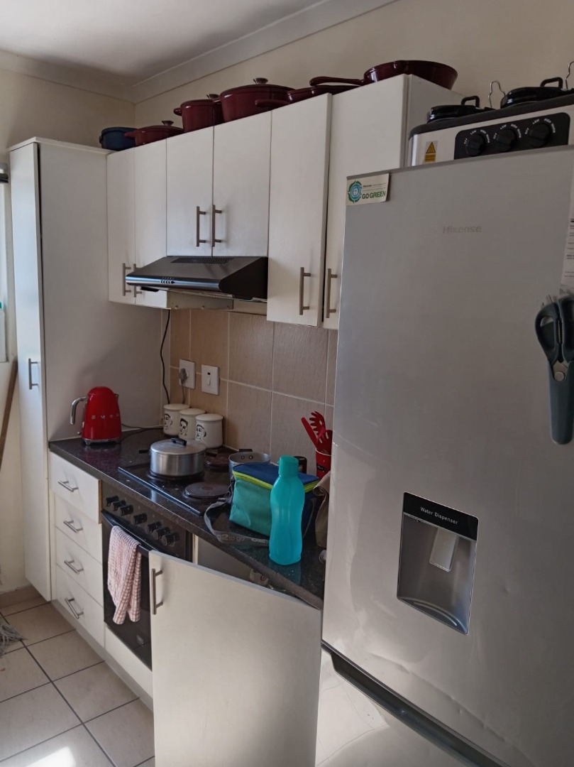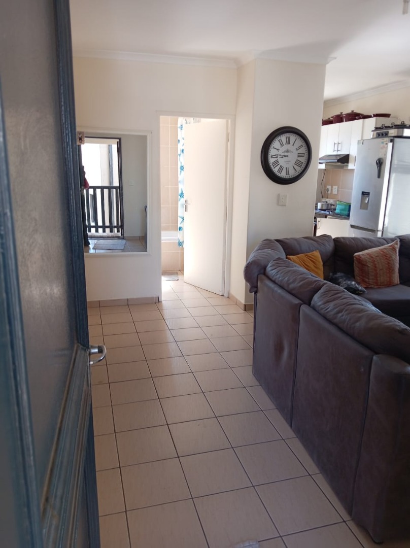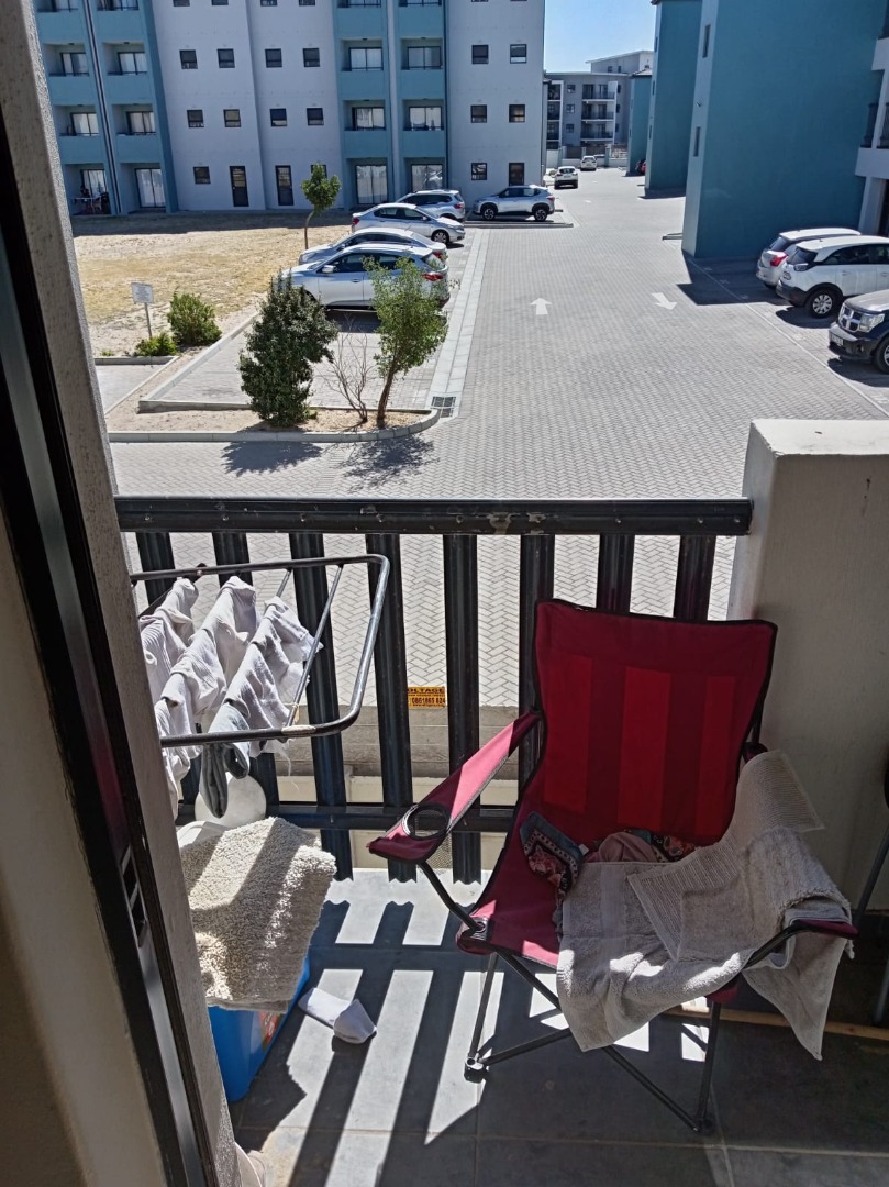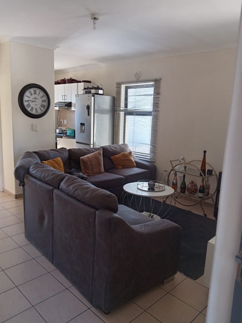 Lovely 2-bedroom, 1-bathroom apartment located in the vibrant Parklands suburb of Blouberg, South Africa. This modern unit offers a practical open-plan layout, seamlessly connecting the living area with a well-appointed kitchen. The kitchen boasts contemporary white cabinetry, dark countertops, and a tiled backsplash, complemented by a built-in oven, electric hob with a range hood.Situated within a modern, clean gated community, residents benefit from enhanced security measures, including a visible security gate and gatehouse at the entrance. The unit itself is further secured with a metal security gate at the front door. A dedicated parking bay is provided, ensuring convenience and peace of mind for vehicle owners within the complex.