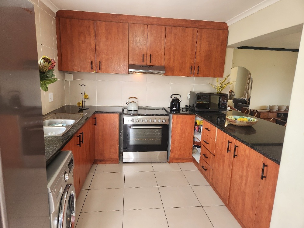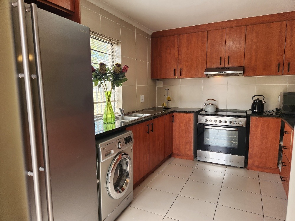 The ground floor comprises of an open plan living area for the lounge and dining room. The kitchen is fitted with ample cupboards, has space for a double door fridge and freezer. There is also a breakfast counter.