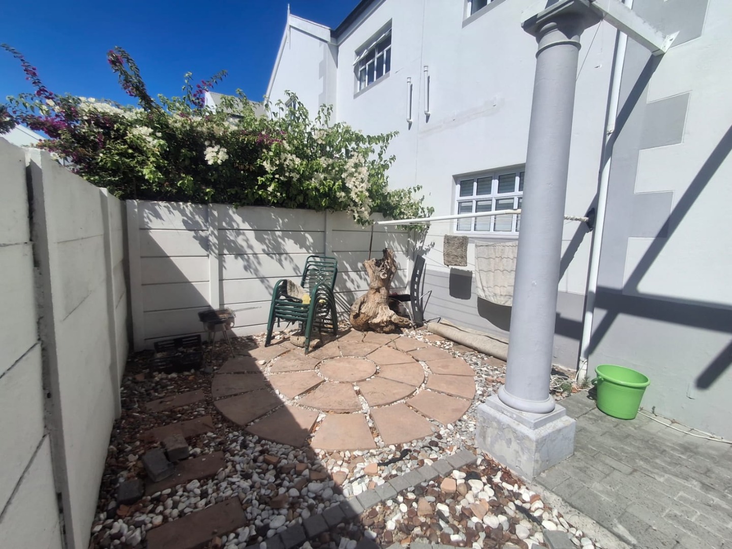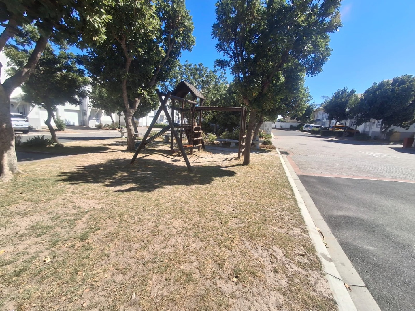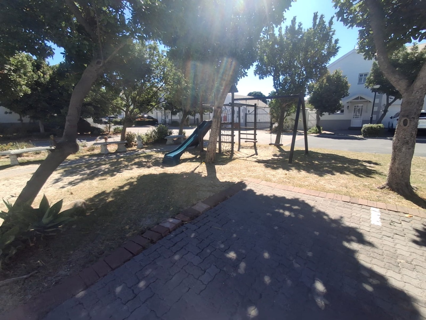 This Fully Furnished home is designed for a convenient lifestyle, offering a private outdoor patio with a charming pergola, ideal for relaxation or entertaining. Additionally, a walled courtyard adorned with vibrant bougainvillea provides a secluded retreat. The property includes an integrated garage and an additional parking space, ensuring ample provision for vehicles. The complex itself enhances family living with well-maintained communal children's play areas, complete with slides, swings, and climbing frames, set amidst mature trees for shade.
