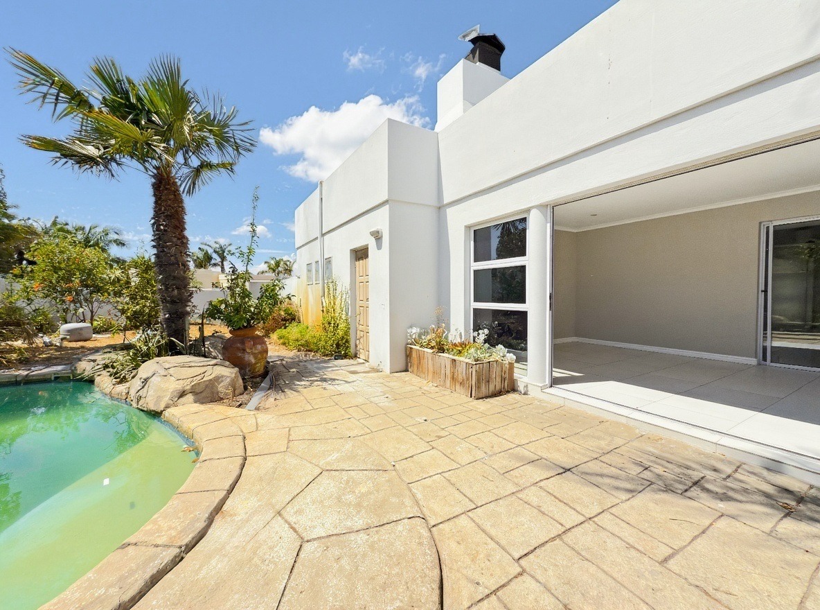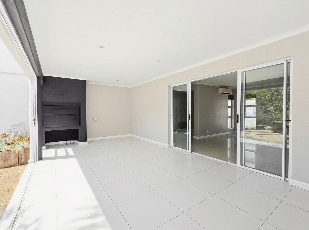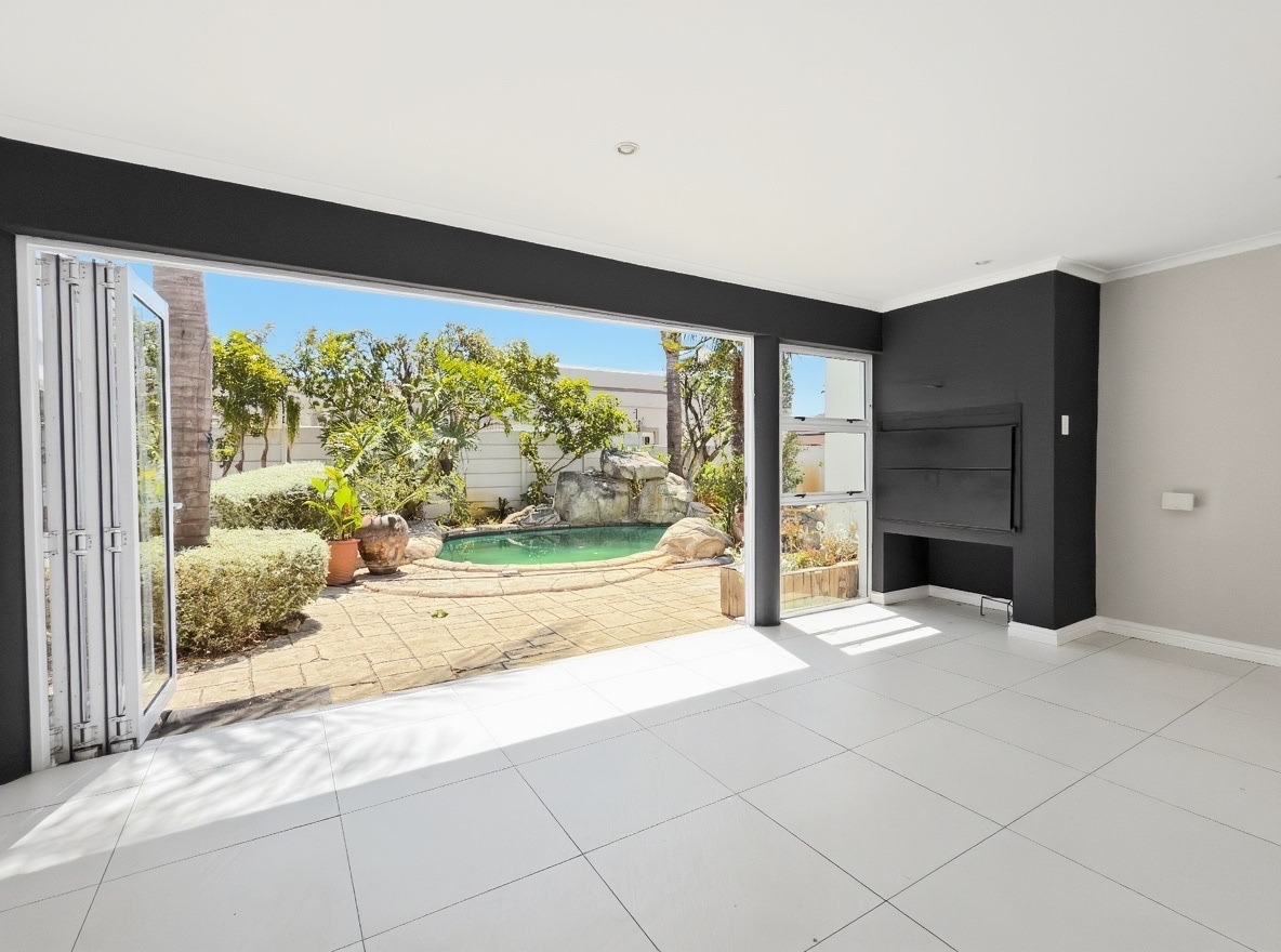 The living and dining areas open onto an enclosed braai room, which leads out to a swimming pool and a spacious garden. Parking includes a double garage as well as additional parking in front of the driveway.