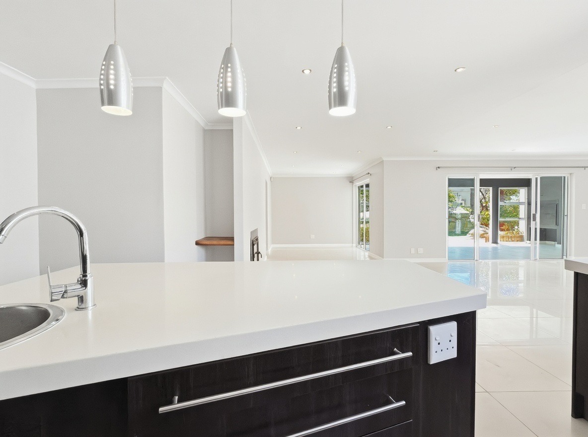 The kitchen is open plan and includes a scullery. It is fitted with a gas hob, electric oven, a central island, and ample cupboard space. The scullery provides two plumbing points for a washing machine and dishwasher. The living and dining areas are open plan, with an air conditioner and a fireplace in the living area.