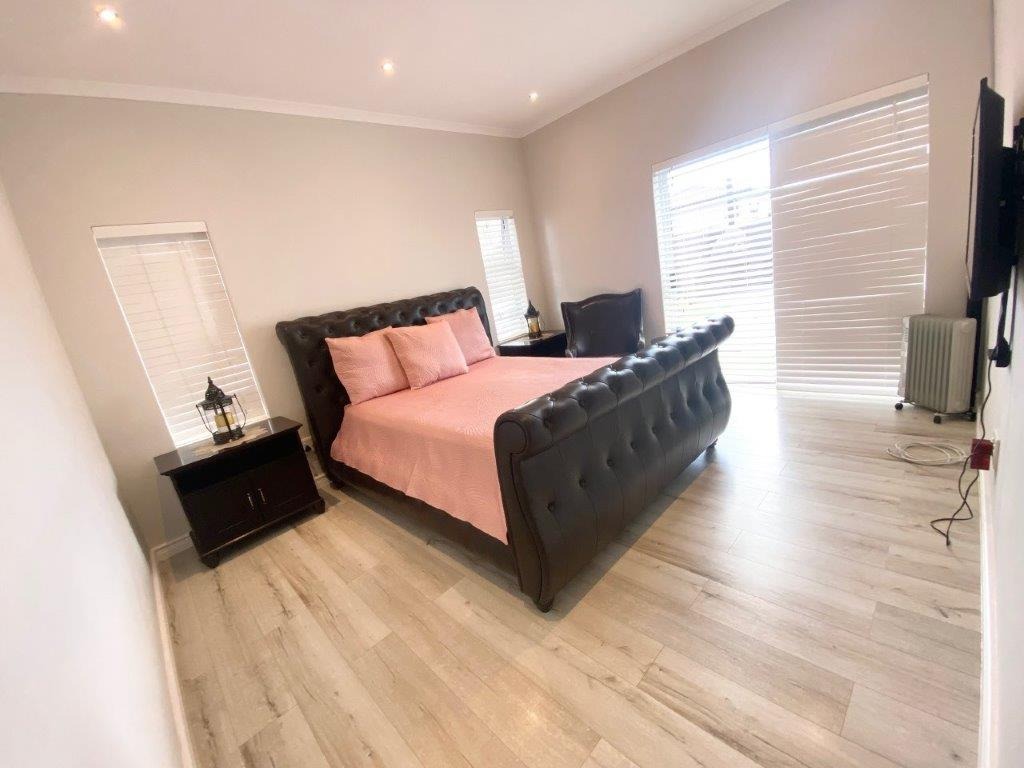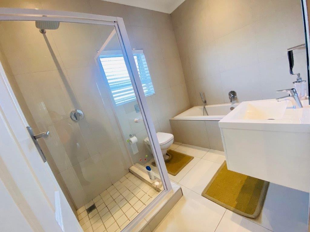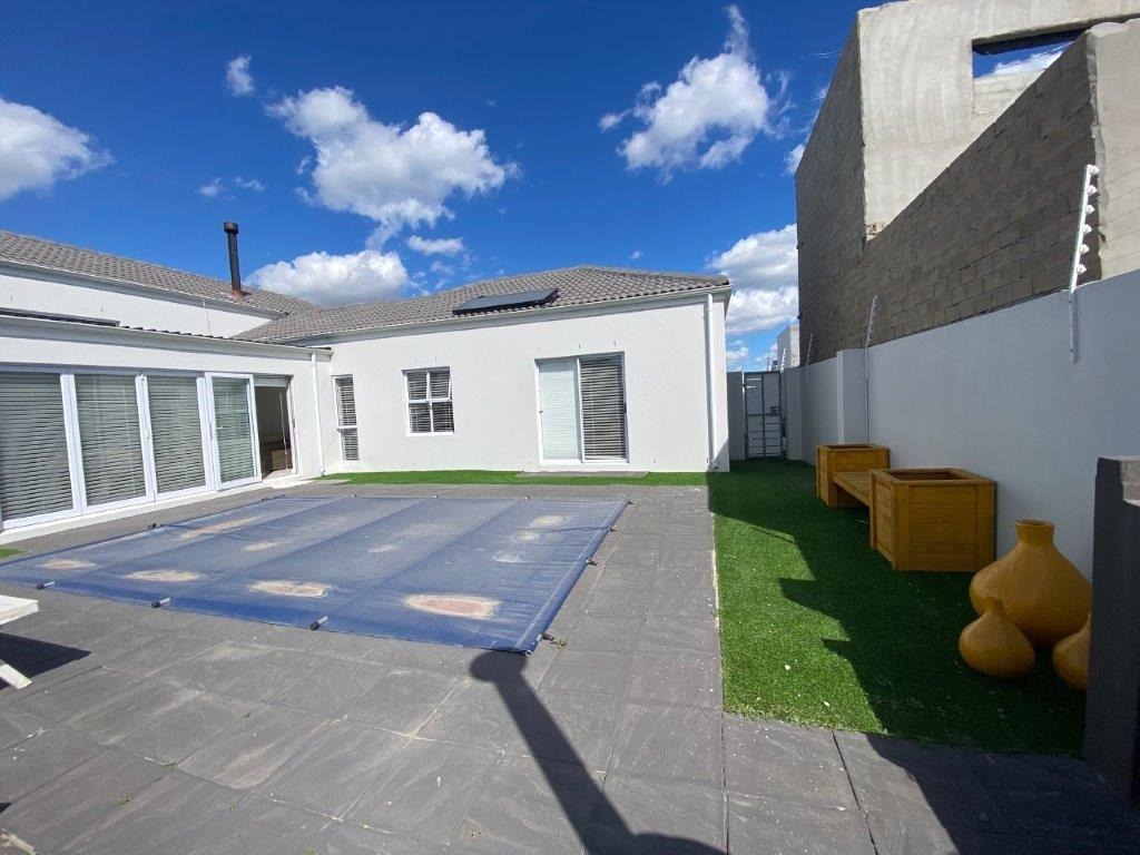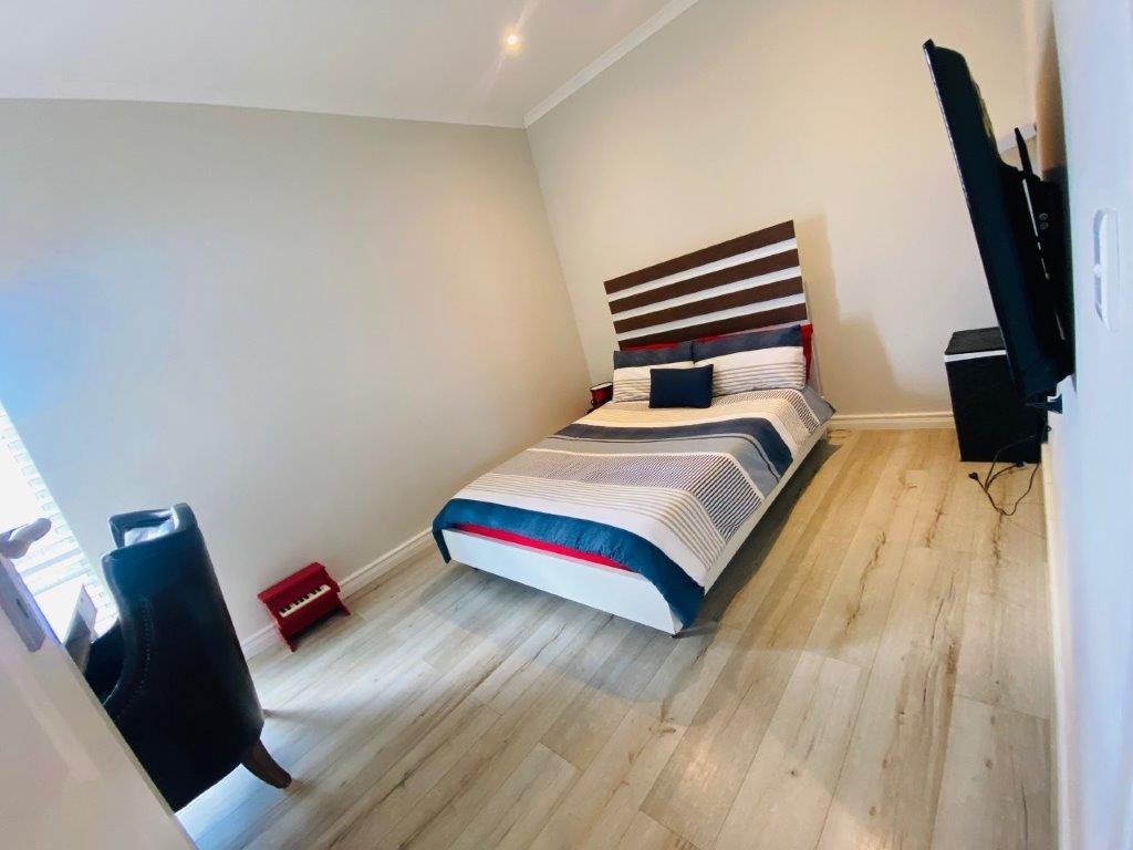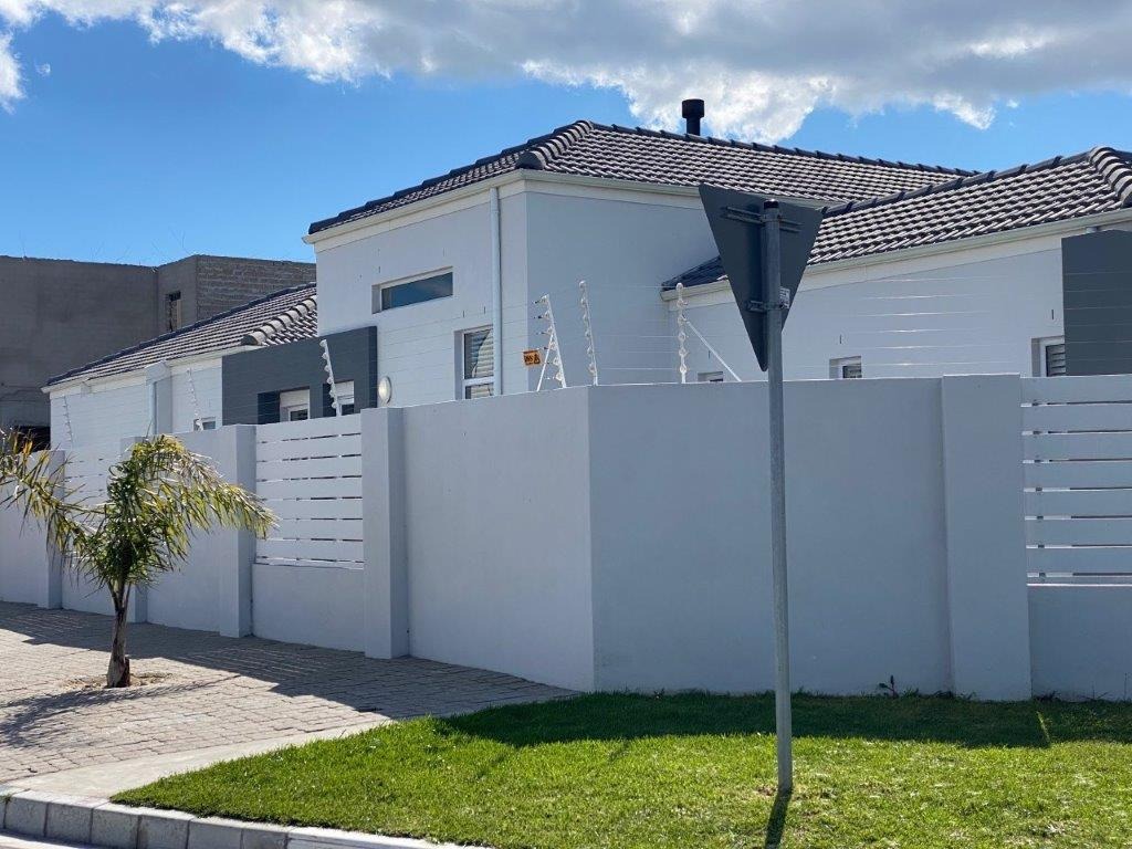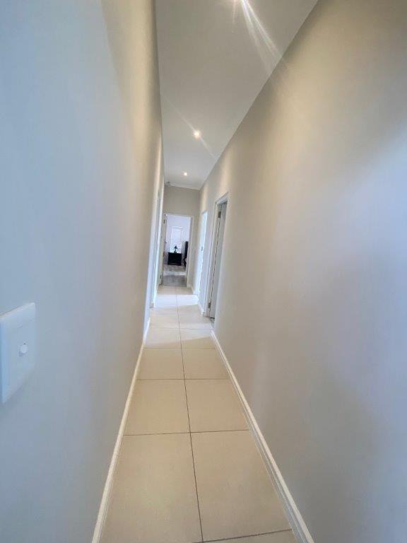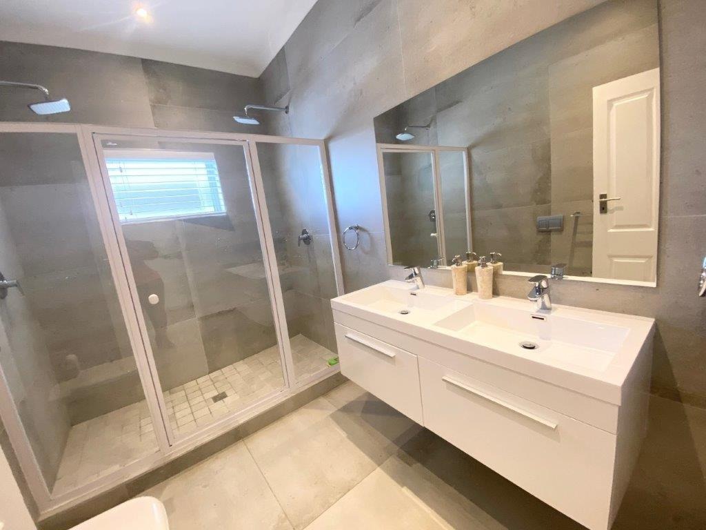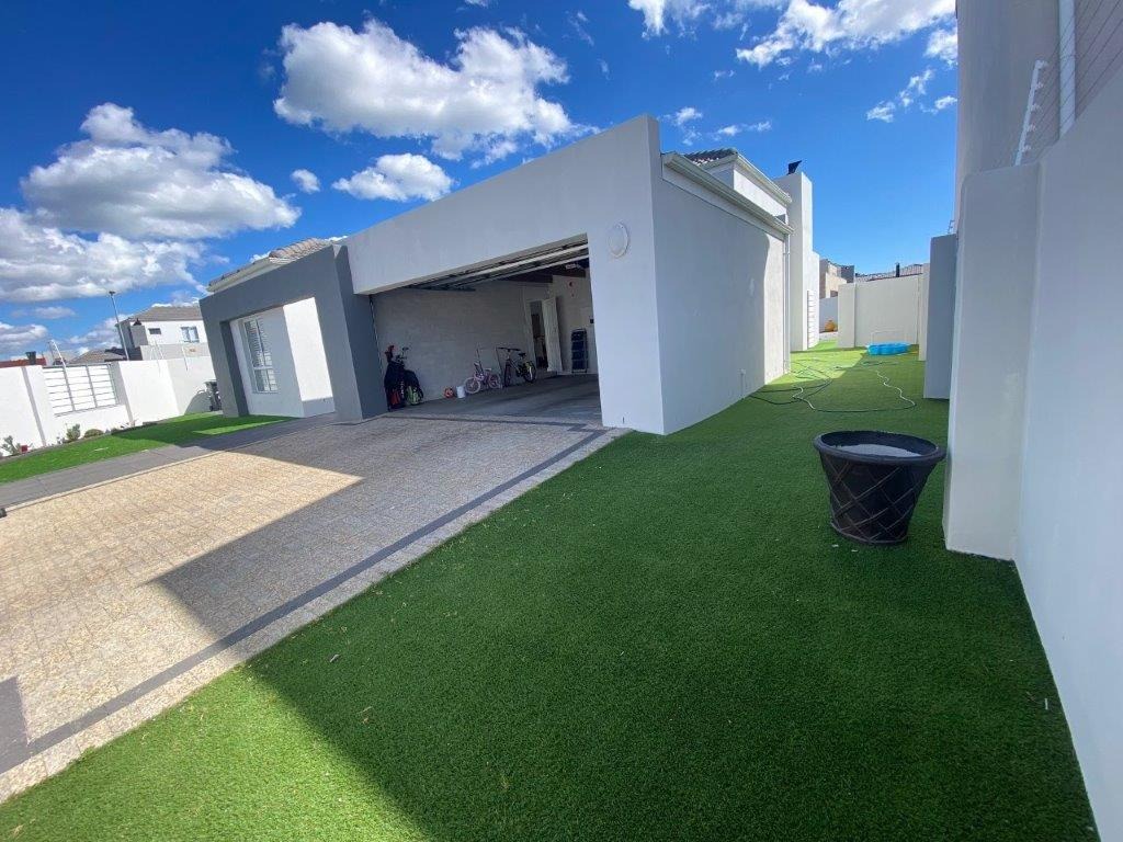 Discover this modern 4-bedroom, 3-bathroom home available for rent in Sandown, Blouberg. The residence features an expansive open-plan layout, seamlessly connecting a contemporary kitchen, dining area, and lounge. The kitchen boasts white cabinetry, dark countertops, a central island, and stainless steel appliances, complemented by a stylish black subway tile backsplash. High ceilings and sleek tiled flooring enhance the spacious feel, with a striking fireplace adding warmth and character. A dedicated laundry area and two garages provide convenience. The property ensures peace of mind with high perimeter walls, an electric fence, and an access gate. Sandown offers a desirable suburban lifestyle in Blouberg.