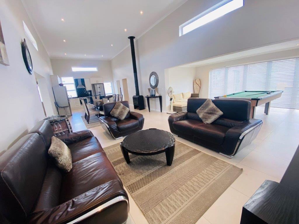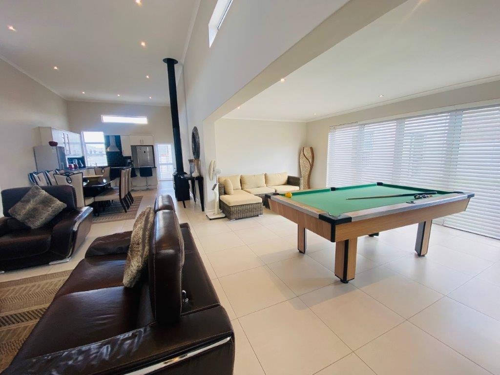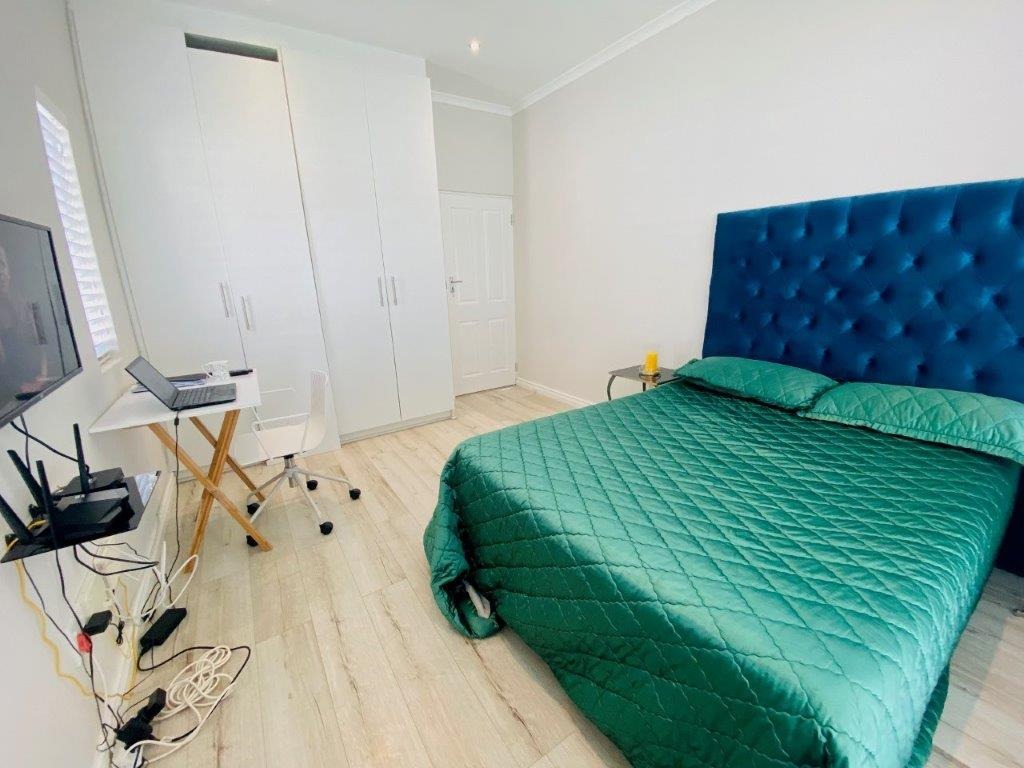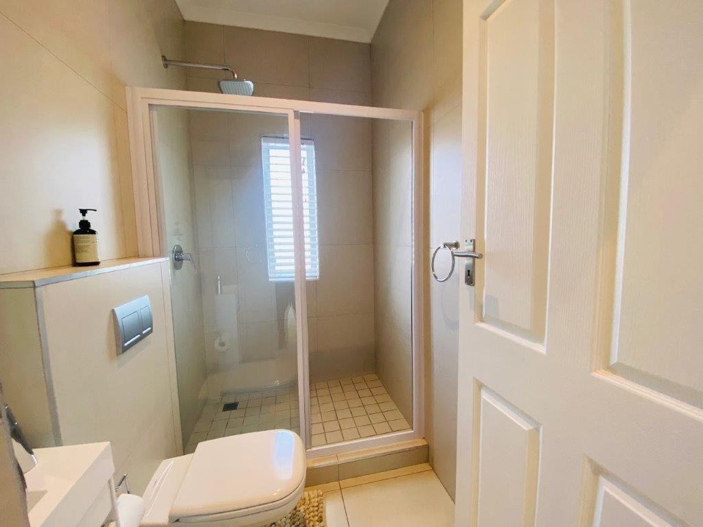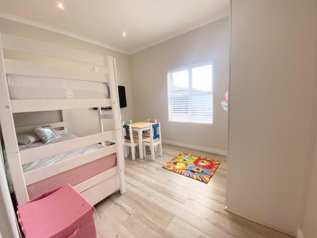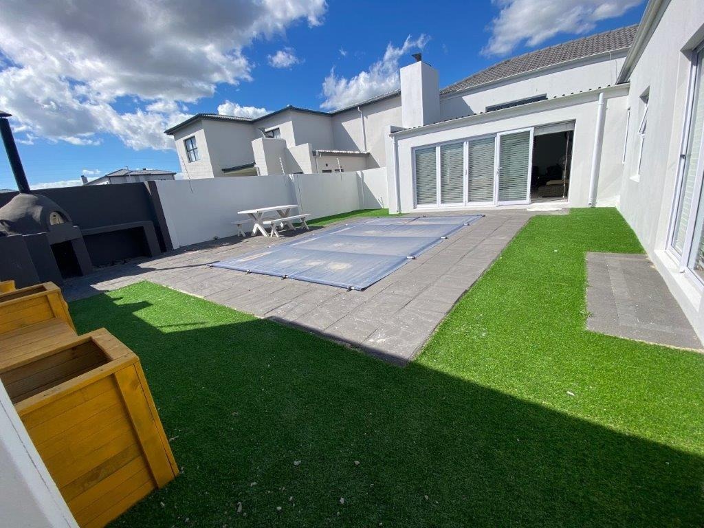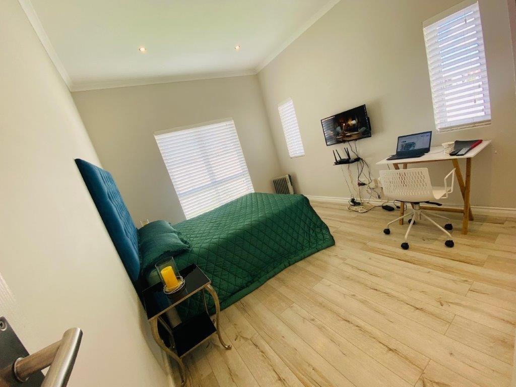 Discover this modern 4-bedroom, 3-bathroom home available for rent in Sandown, Blouberg. The residence features an expansive open-plan layout, seamlessly connecting a contemporary kitchen, dining area, and lounge. The kitchen boasts white cabinetry, dark countertops, a central island, and stainless steel appliances, complemented by a stylish black subway tile backsplash. High ceilings and sleek tiled flooring enhance the spacious feel, with a striking fireplace adding warmth and character. A dedicated laundry area and two garages provide convenience. The property ensures peace of mind with high perimeter walls, an electric fence, and an access gate. Sandown offers a desirable suburban lifestyle in Blouberg.