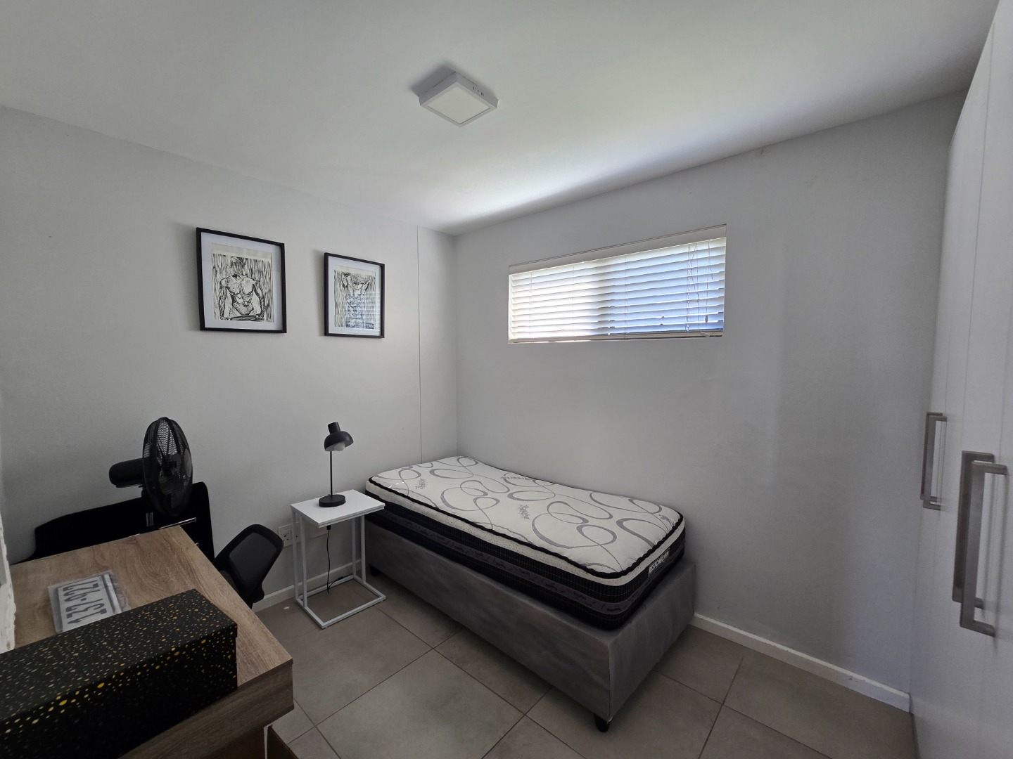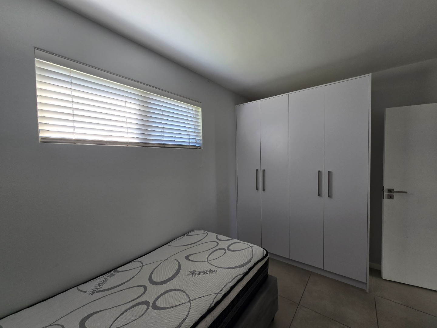 The guest bedroom is tiled and fitted with built-in cupboards with a northfacing window, allowing in the sun, all year round.