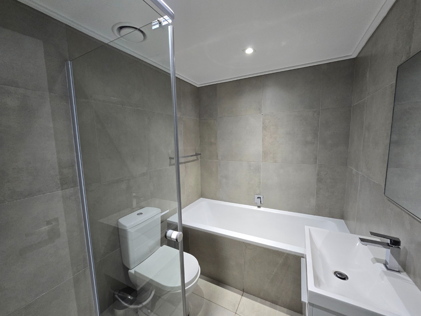 The family bathroom offers a shower, bath, basin and toilet. The main bedroom is also tiled and fitted with built-in cupboards with sliding doors opening up onto the paved garden. The en-suite bathroom consists of a shower, basin and toilet.