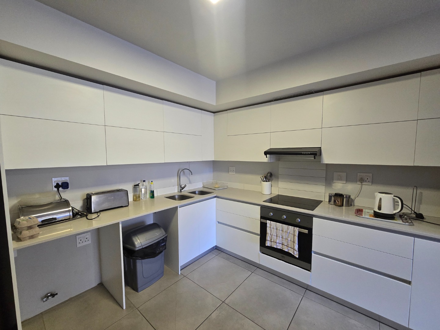 Spacious kitchen finished in white and fitted with oven, hob and extractor fan. Stone tops and touch cupboards as well as two plumbing points.