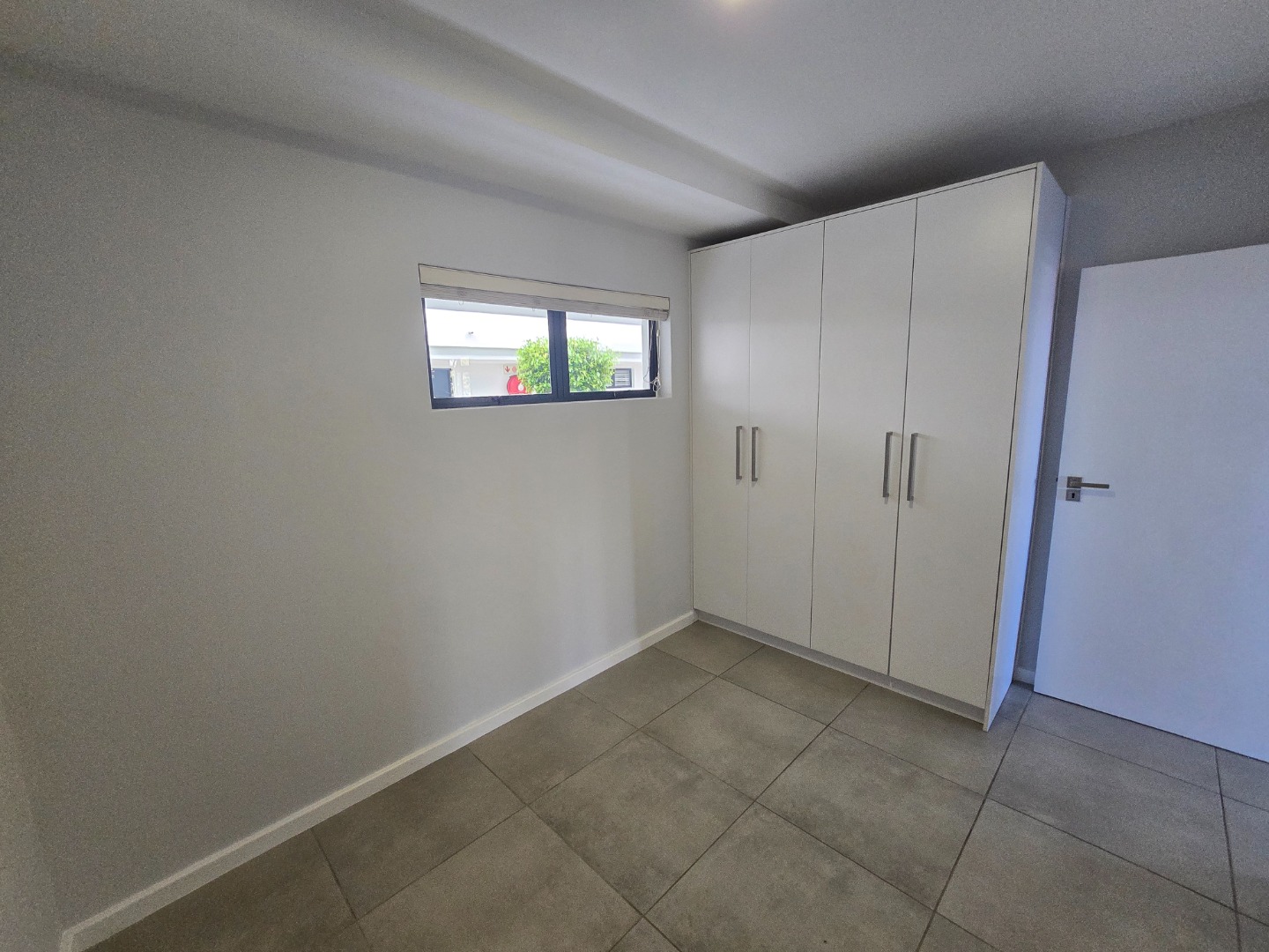 The main bedroom is also tiled and fitted with built-in cupboards with sliding doors opening up onto the paved garden.