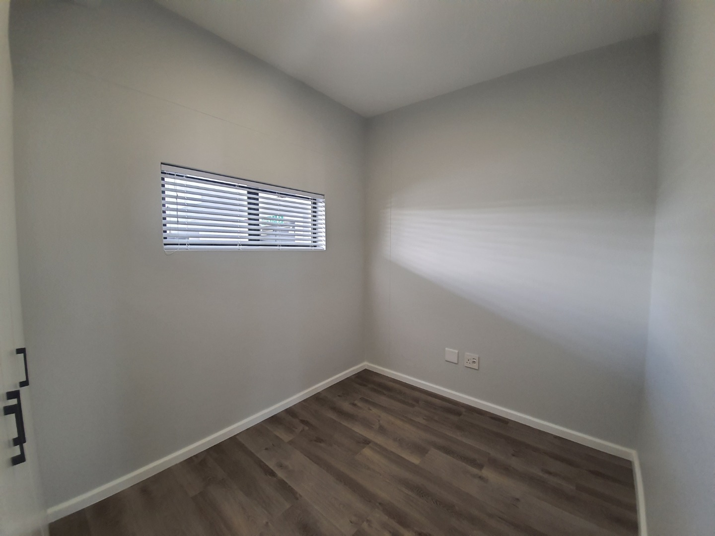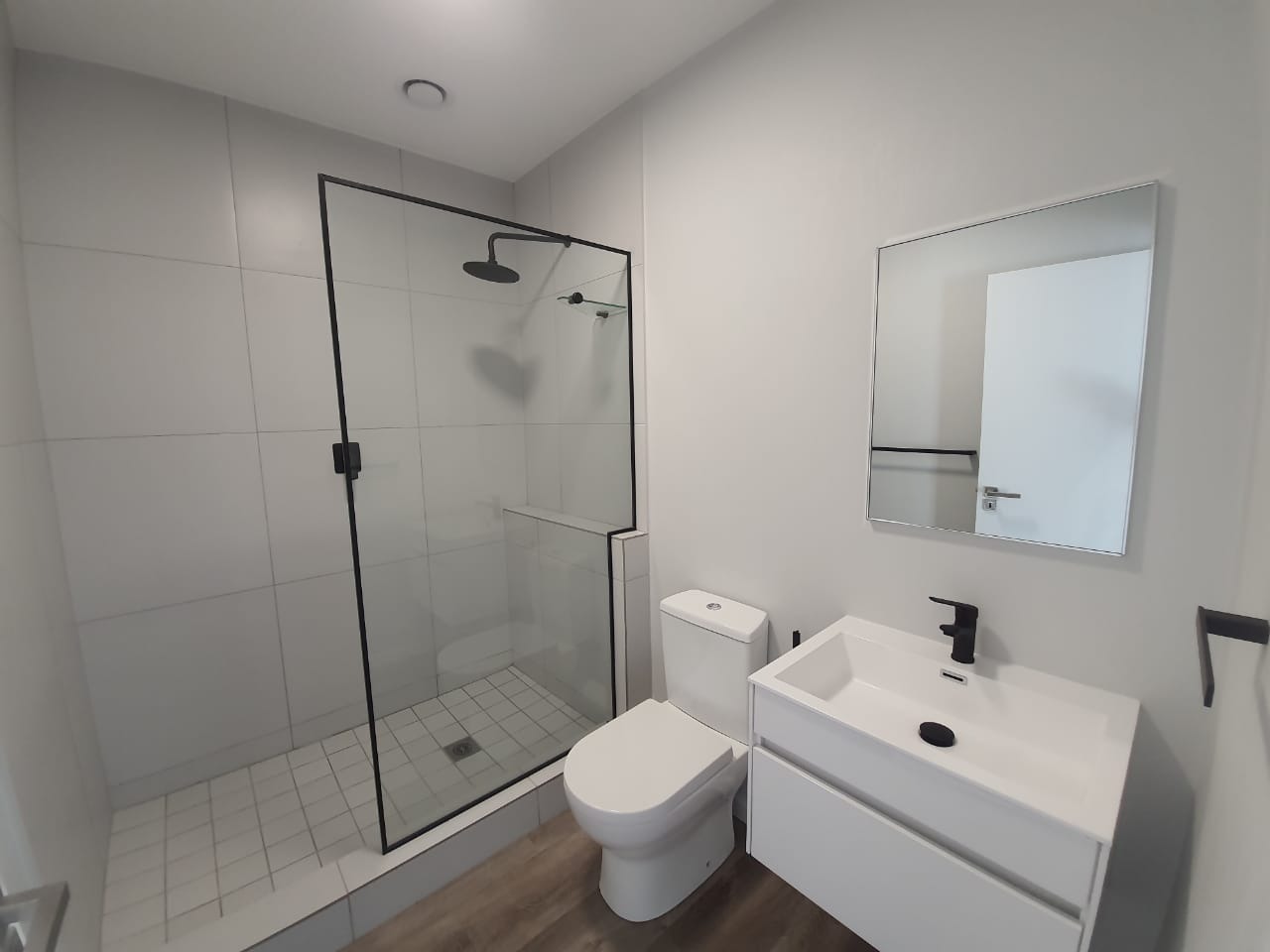 A modern bathroom completes the apartment, finished with stylish fittings and a spacious walk-in shower.