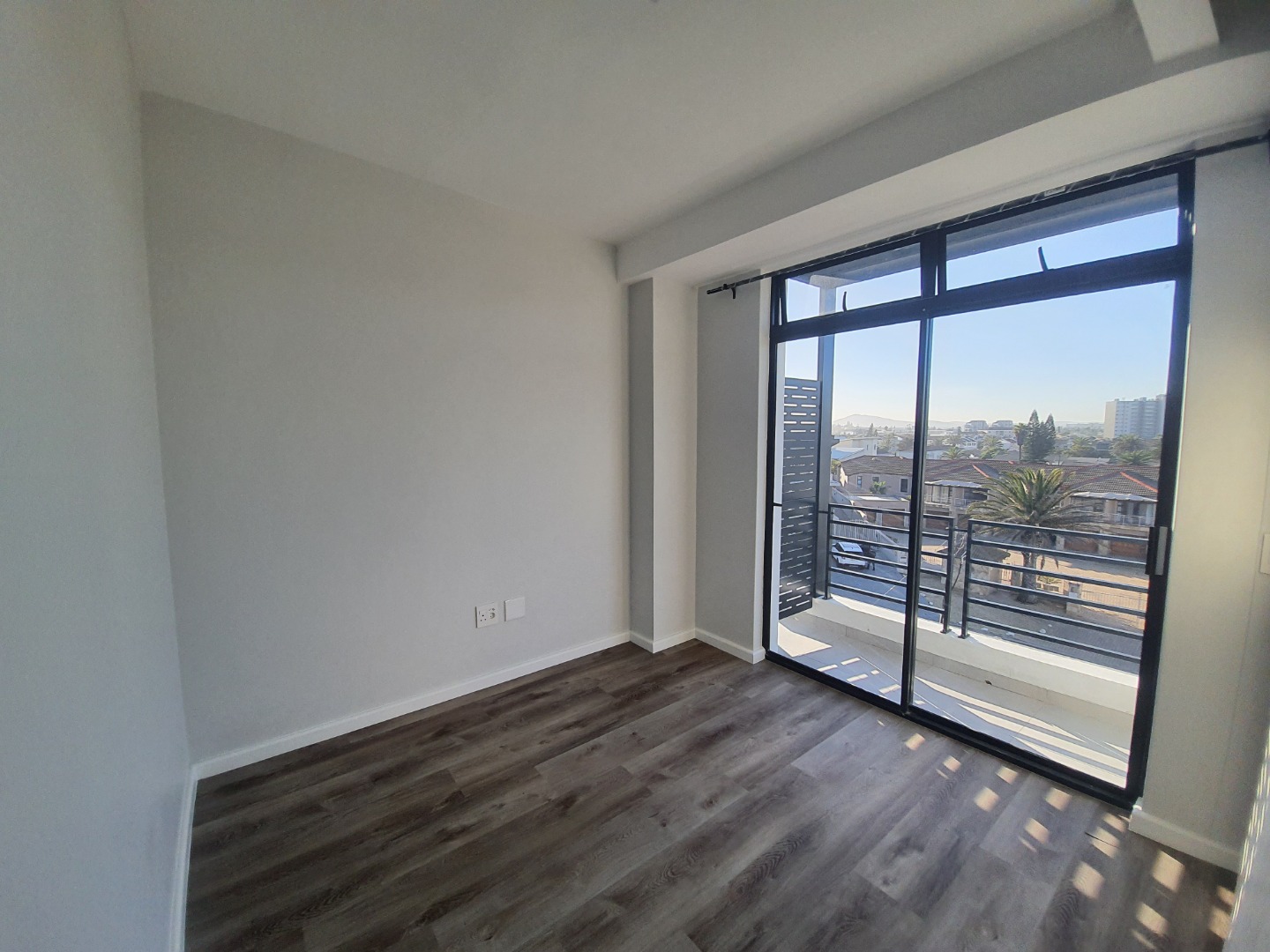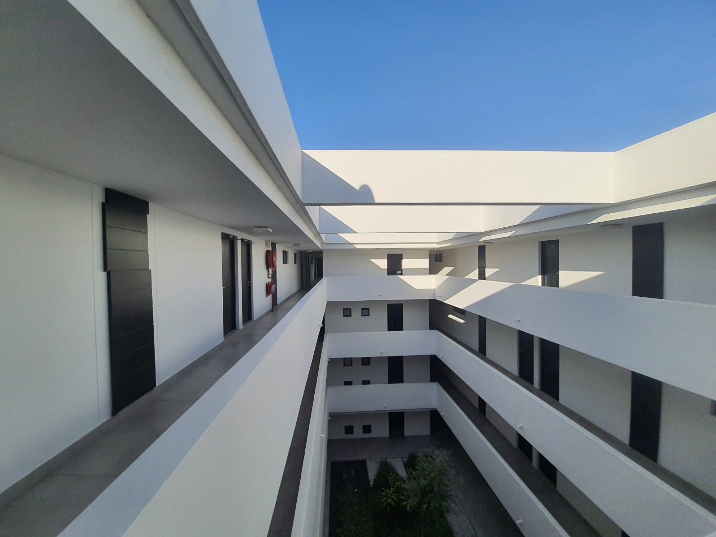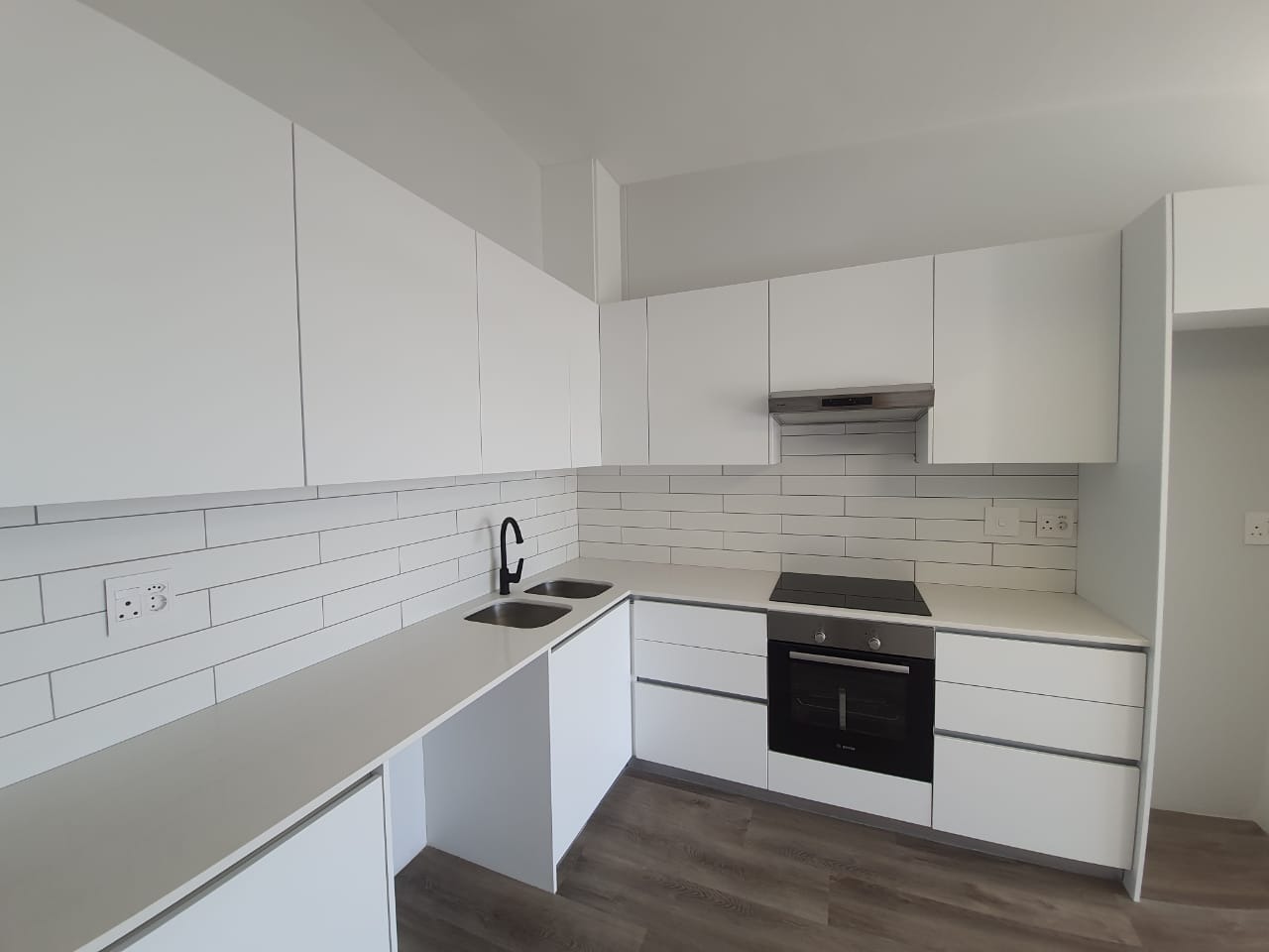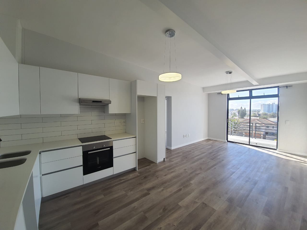 Positioned in a secure, well-maintained block with a communal pool, the apartment welcomes you into a bright and airy open-plan living space. The sleek, contemporary kitchen features clean white cabinetry, a built-in oven, hob, and extractor, flowing seamlessly into the lounge area. Large sliding doors lead out onto a Northfacing balcony, allowing natural light to flood the space while offering lovely views and a refreshing coastal feel.