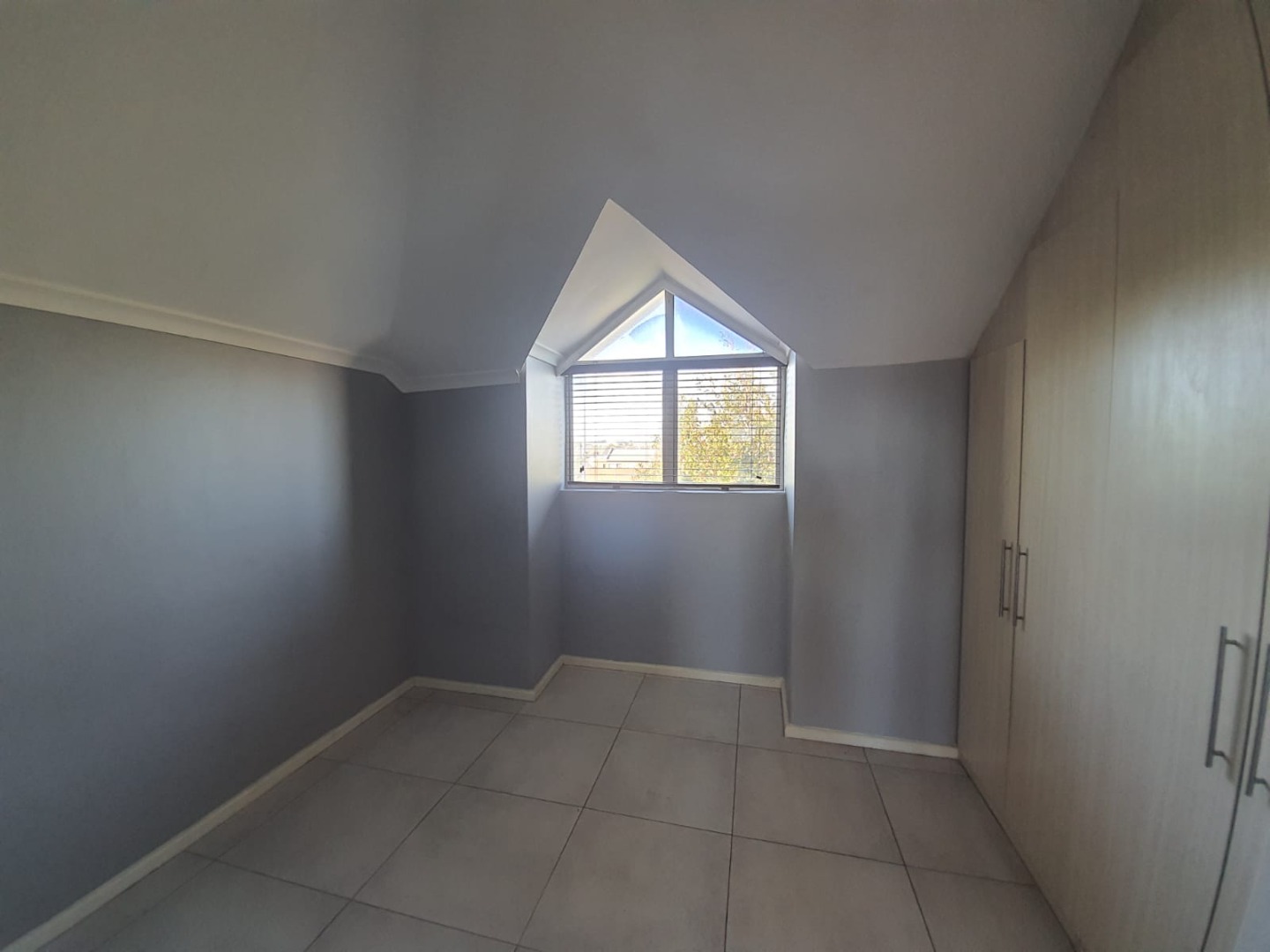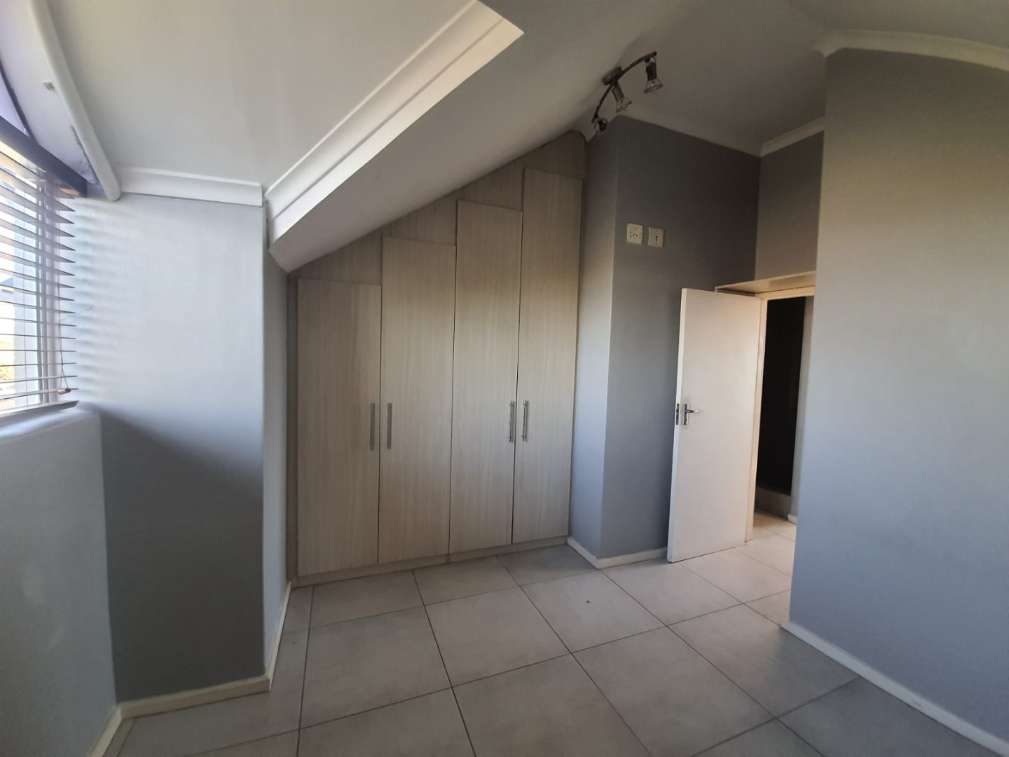 The bedroom is tiled and offers built-in cupboards.