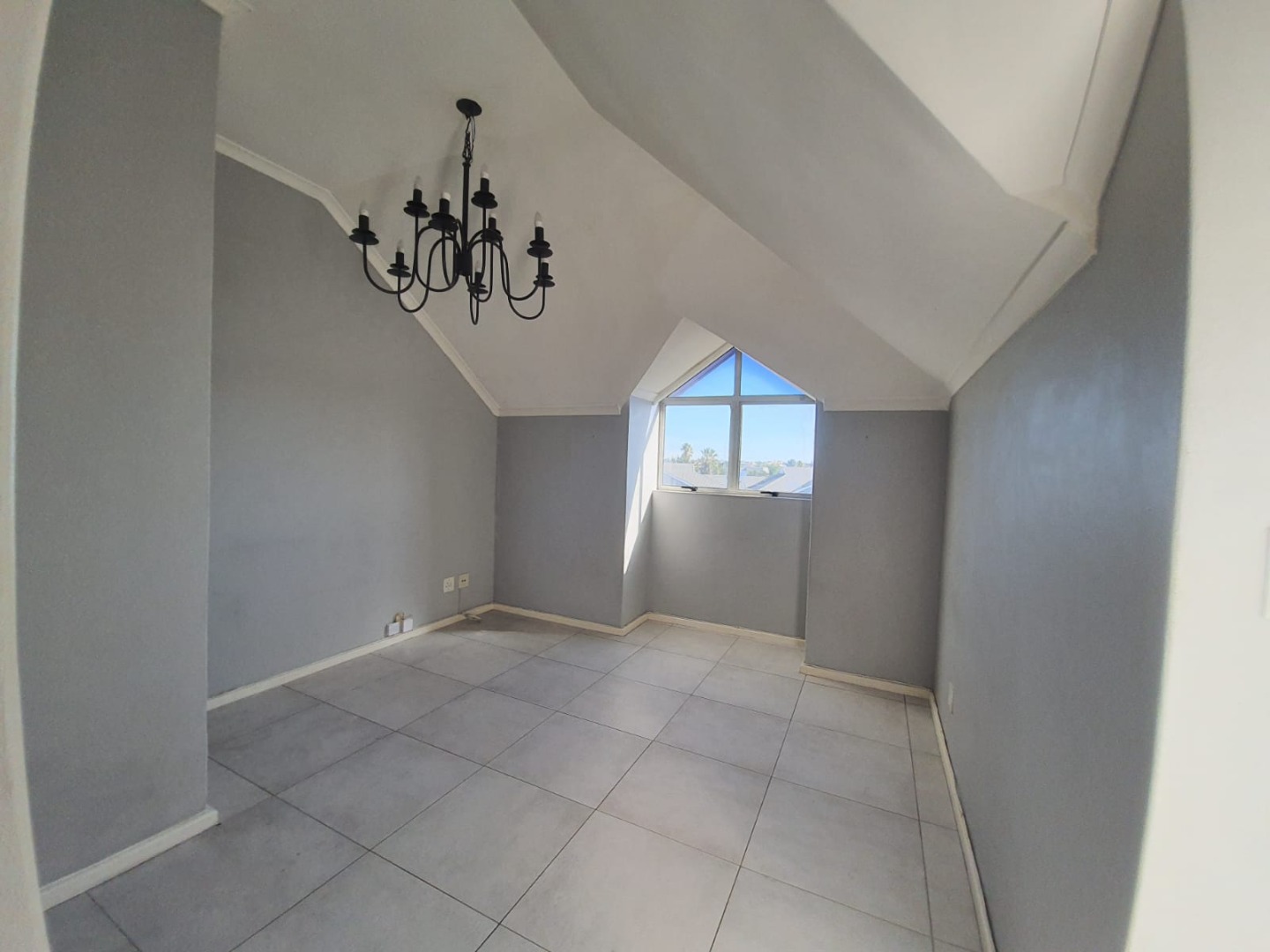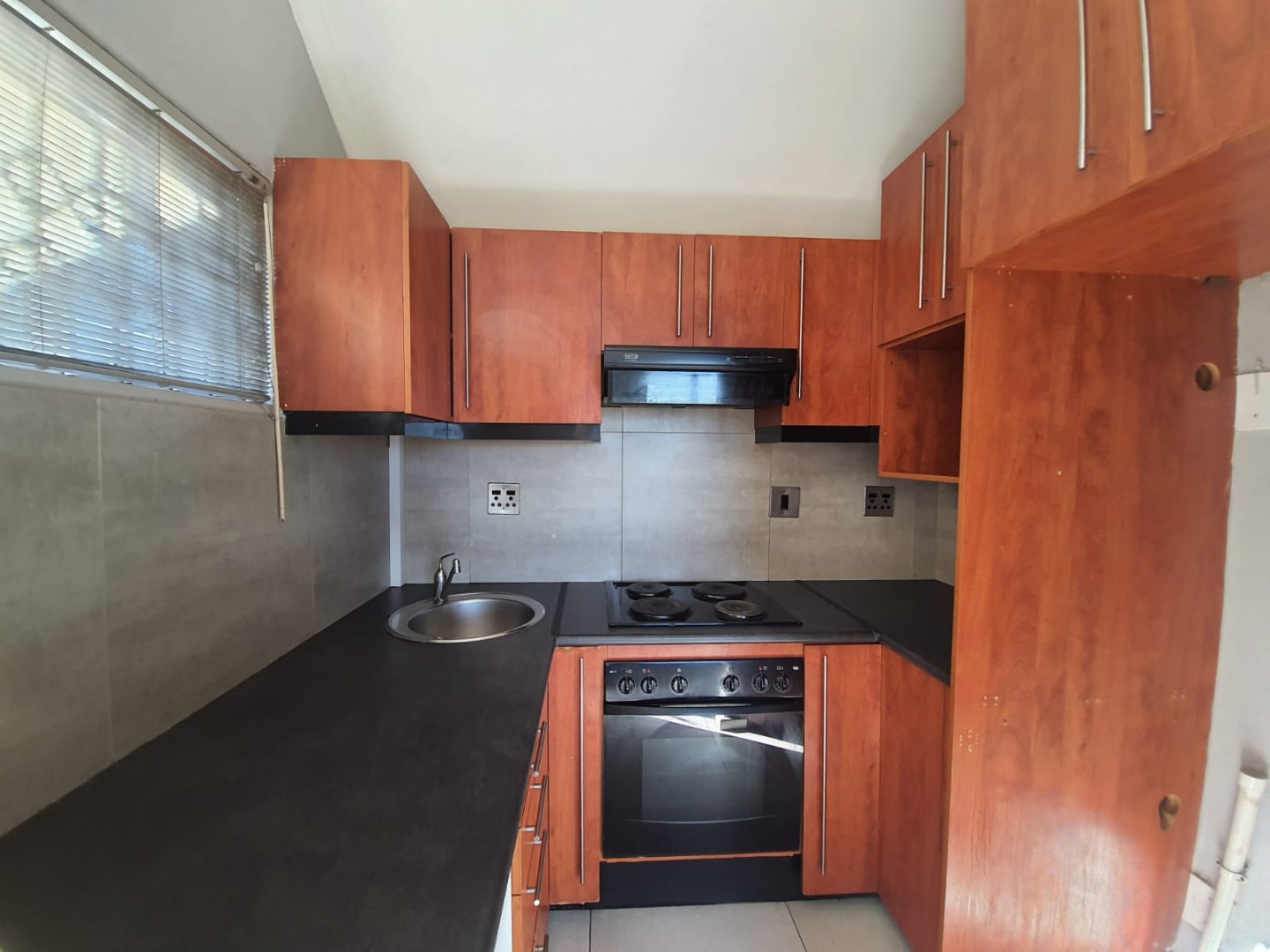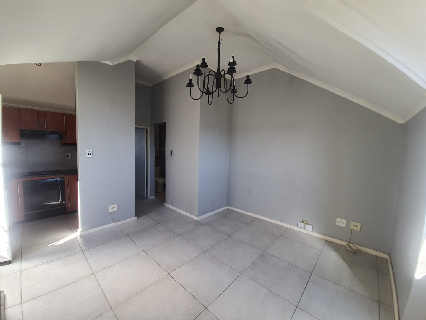 Situated on the second floor of this security complex, this one bedroom apartment offers a tiled living area with high ceilings and fitted chandelier. Open plan kitchen finished in Cherrywood and fitted with an oven, hob and extractor fan.