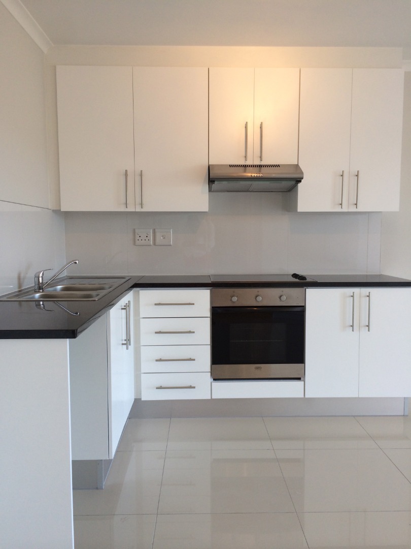 Open plan modern kitchen and living area, leading to a large sunny balcony