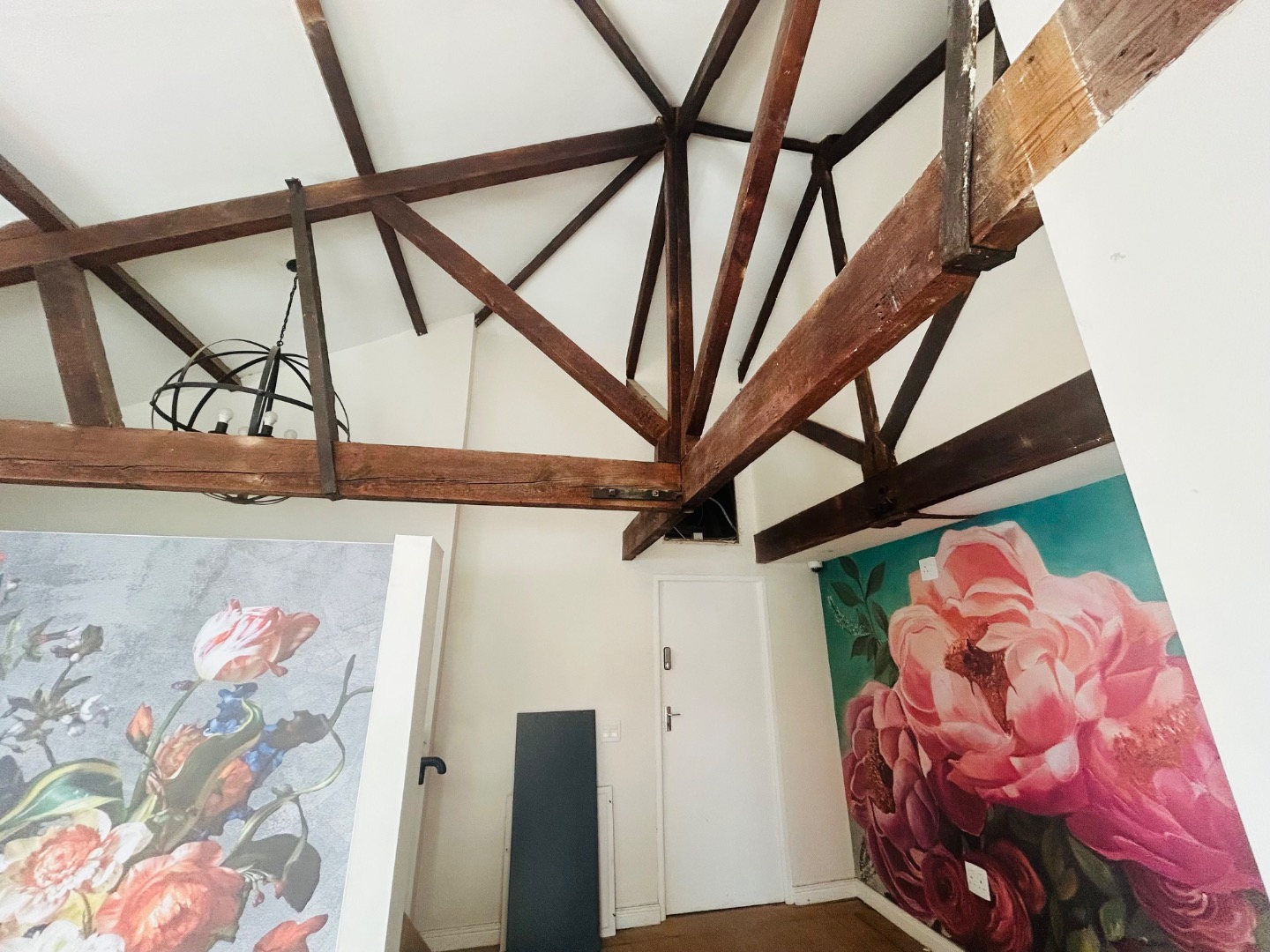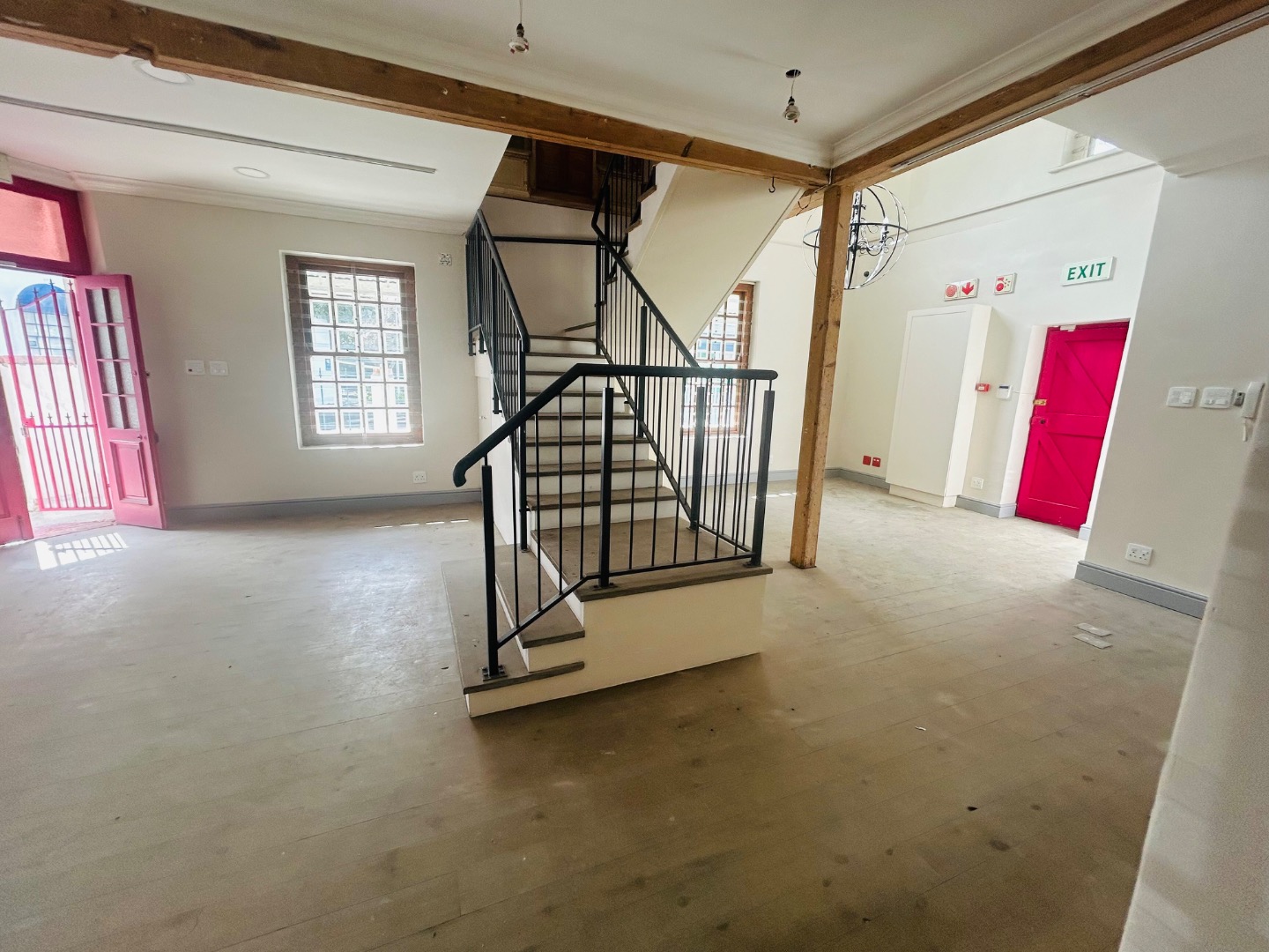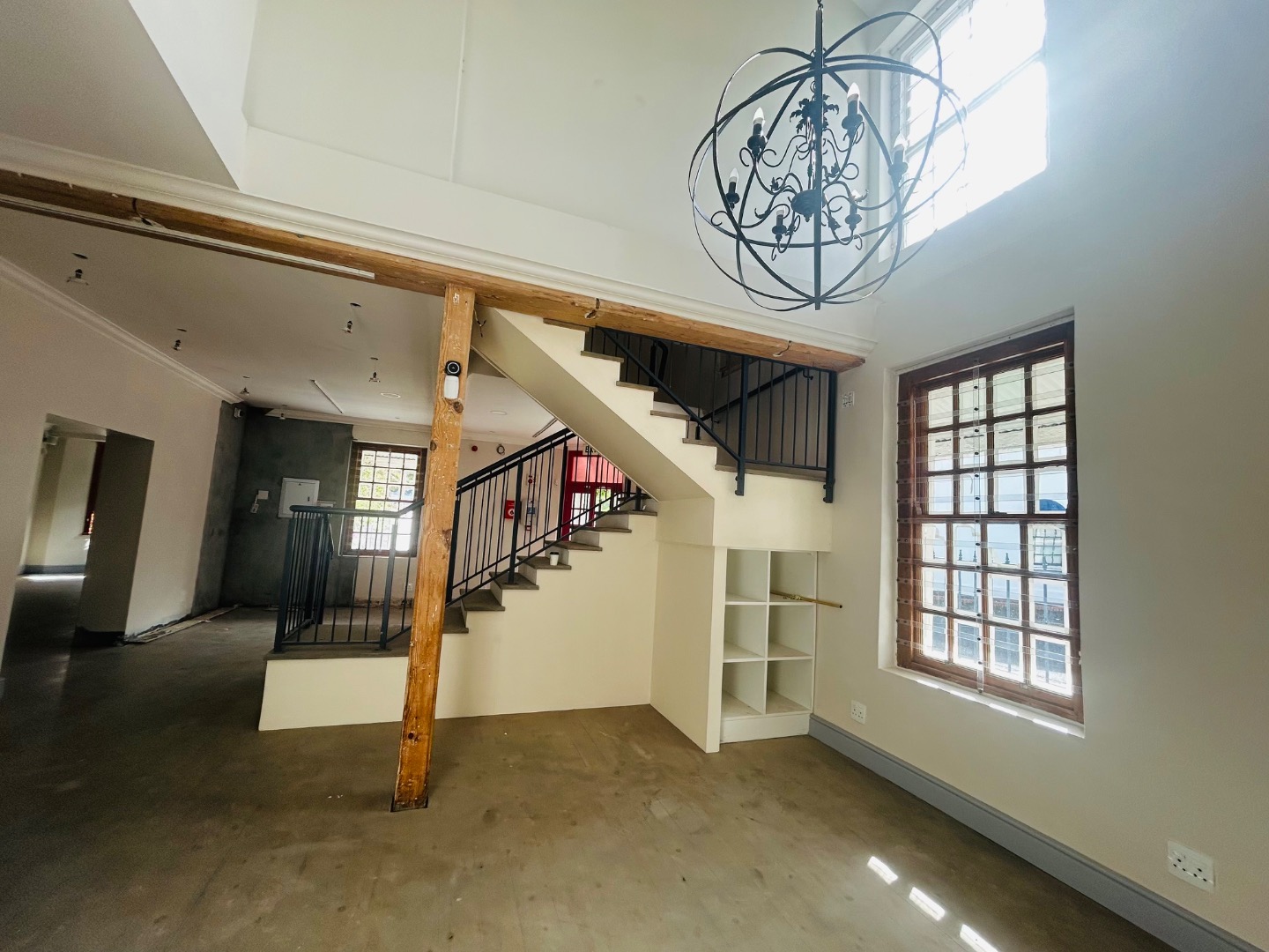 On two levels, with ground floor covering 75m2 plus 25m2 on top level, high ceilings, rought iron chandeliers and large windows, feature staircase, create a light and welcoming space.