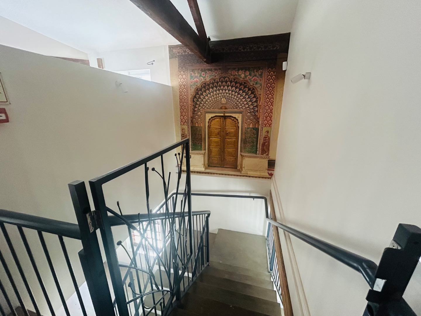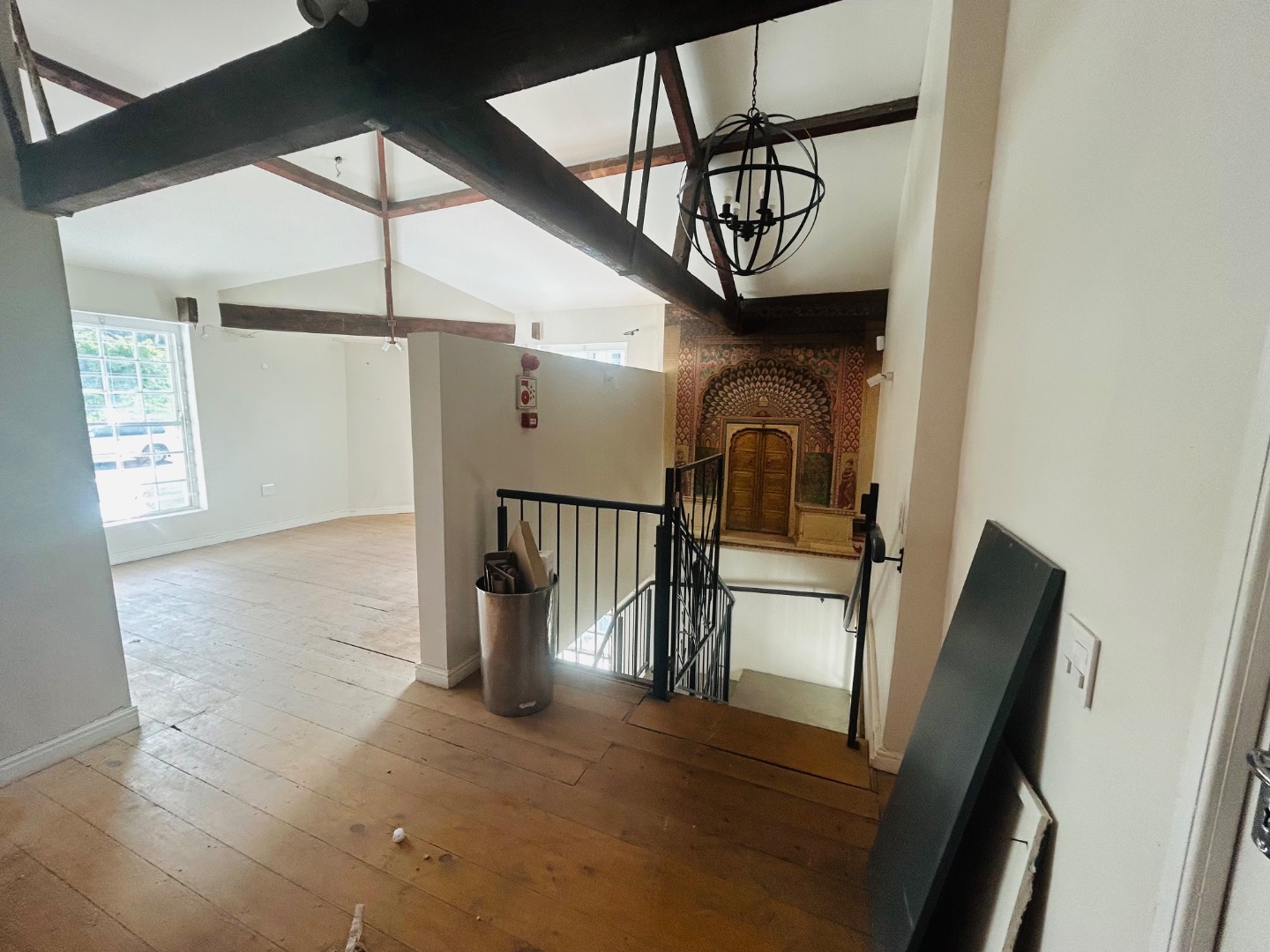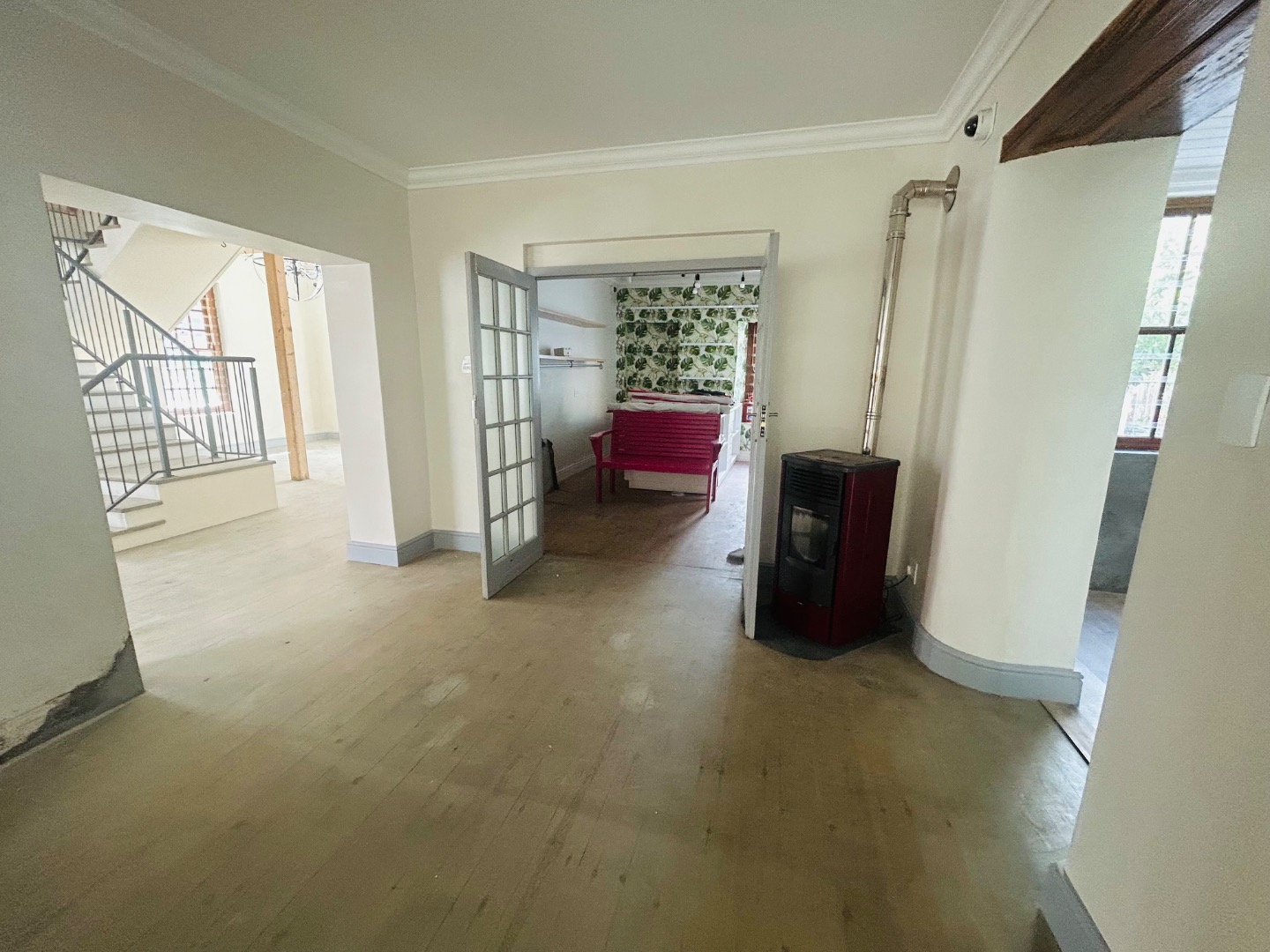 On two levels, with ground floor covering 75m2 plus 25m2 on top level, high ceilings, rought iron chandeliers and large windows, feature staircase, create a light and welcoming space.