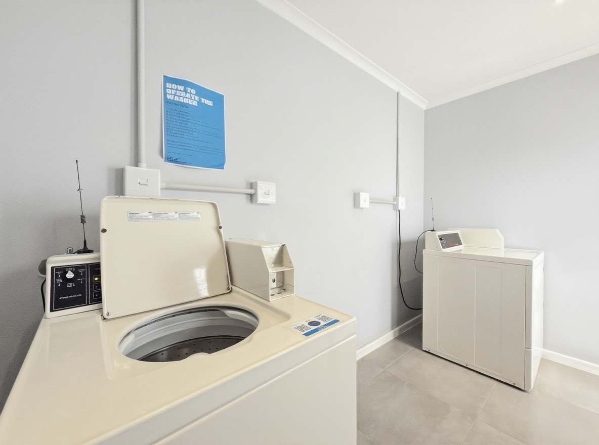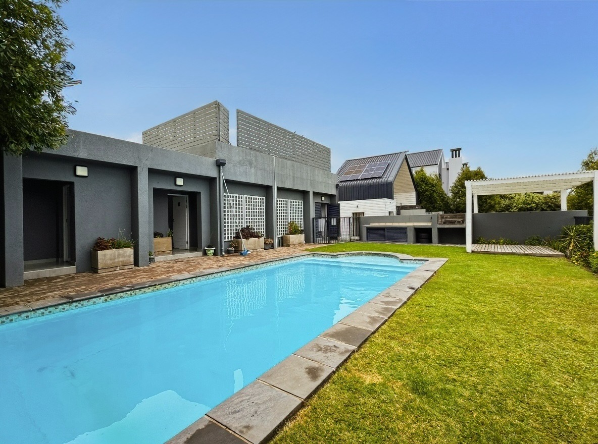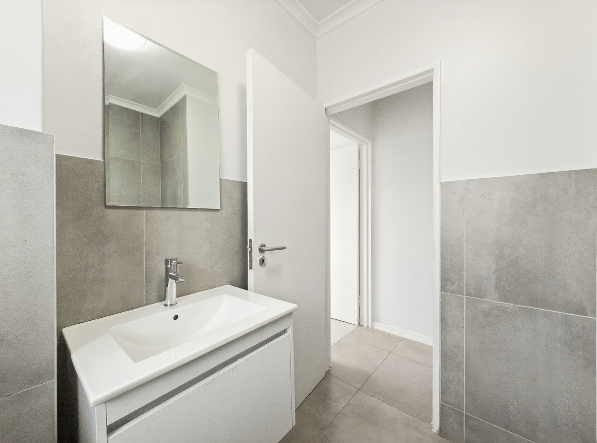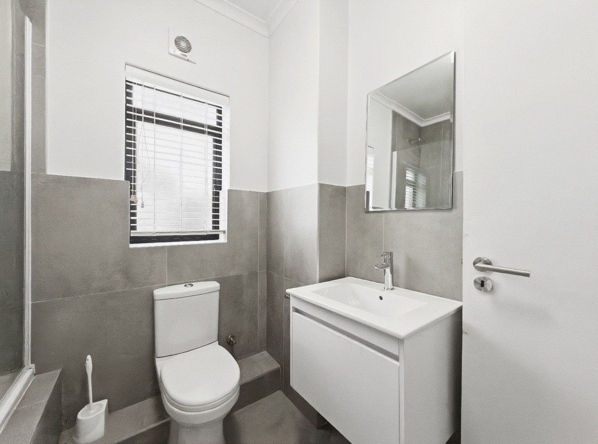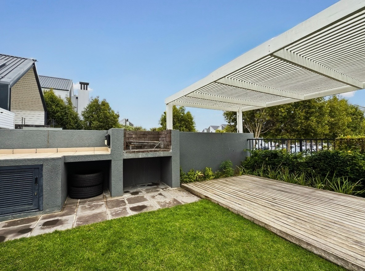The security estate offers a swimming pool, a small communal braai area, and a shared laundry facility. One allocated open parking bay is included. Security features include access-controlled entry and 24-hour security.