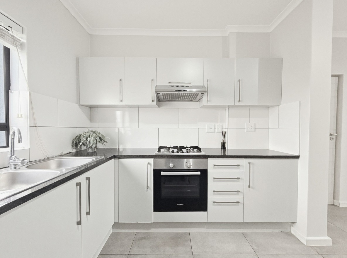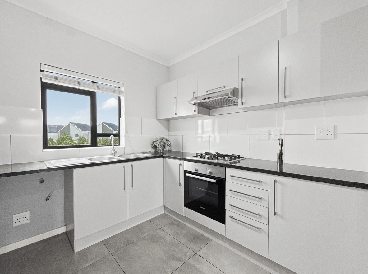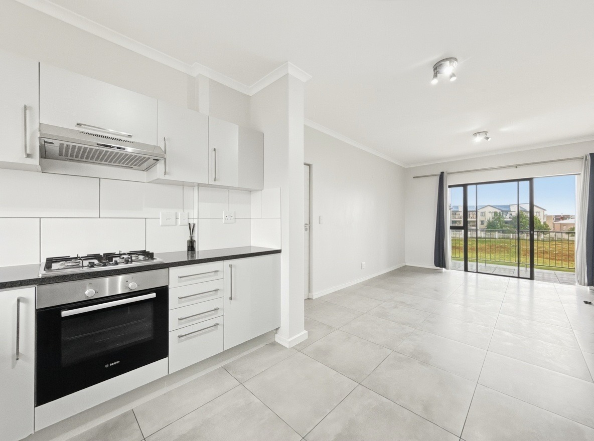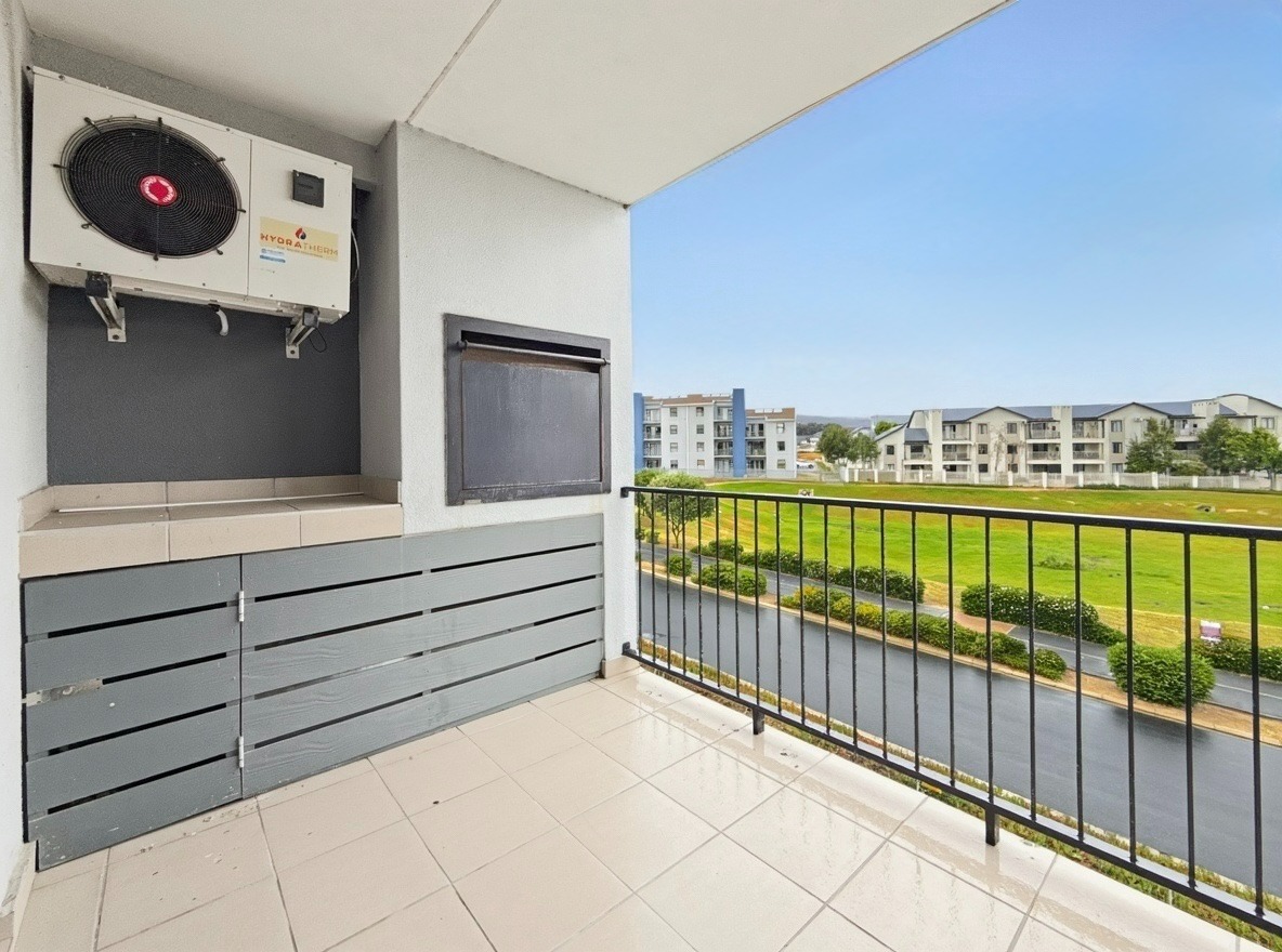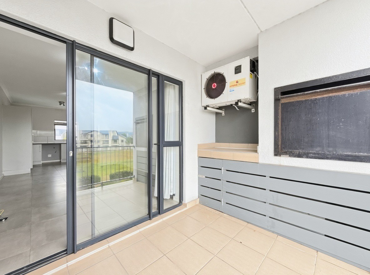 The apartment includes two bedrooms, both with built-in cupboards, and one bathroom with a shower over a bath, basin, and toilet. The kitchen and living area are open plan. The kitchen is fitted with a gas hob, electric oven, and one plumbing point suitable for a washing machine or dishwasher. The living area opens onto a balcony with a built-in braai.