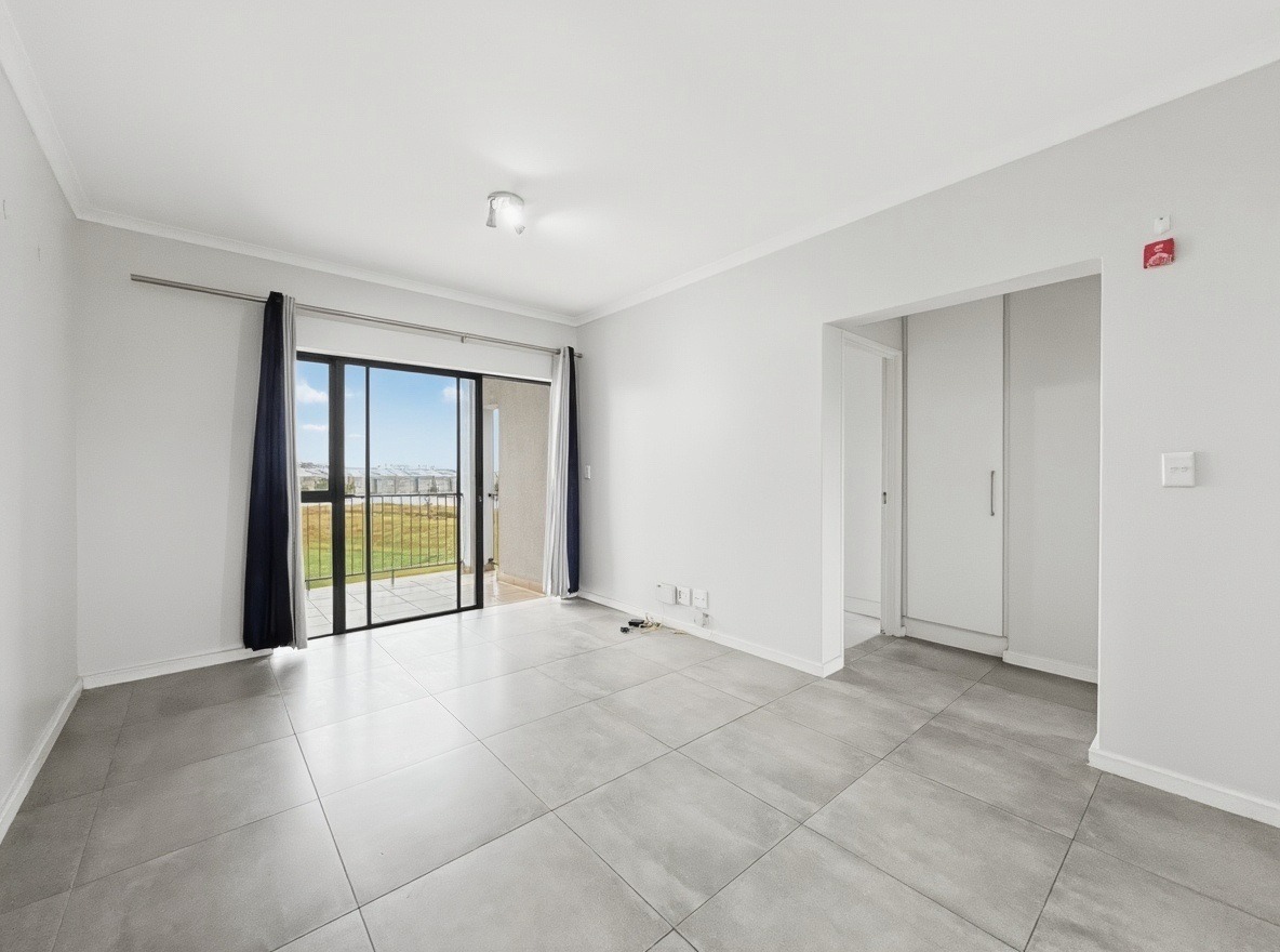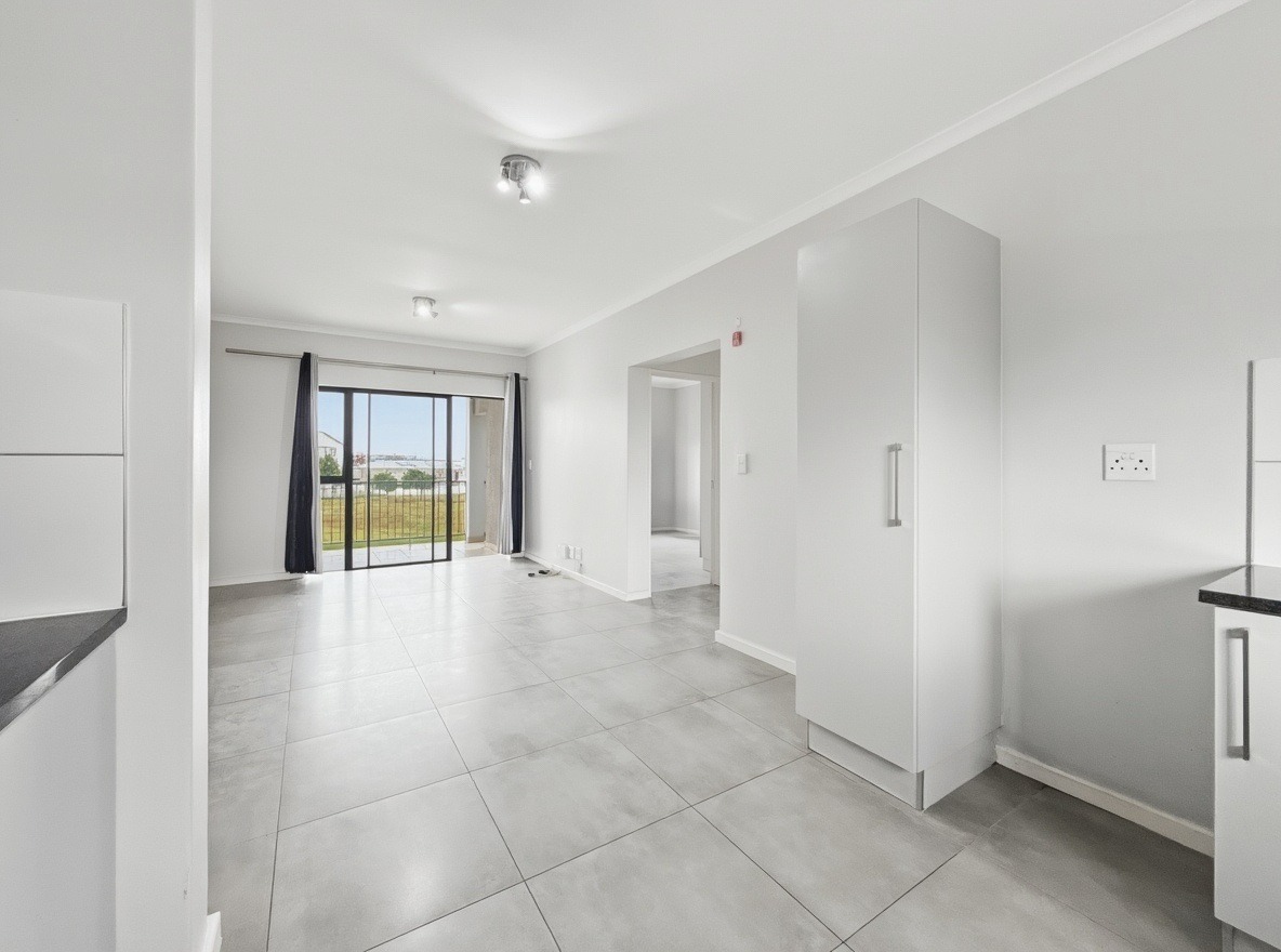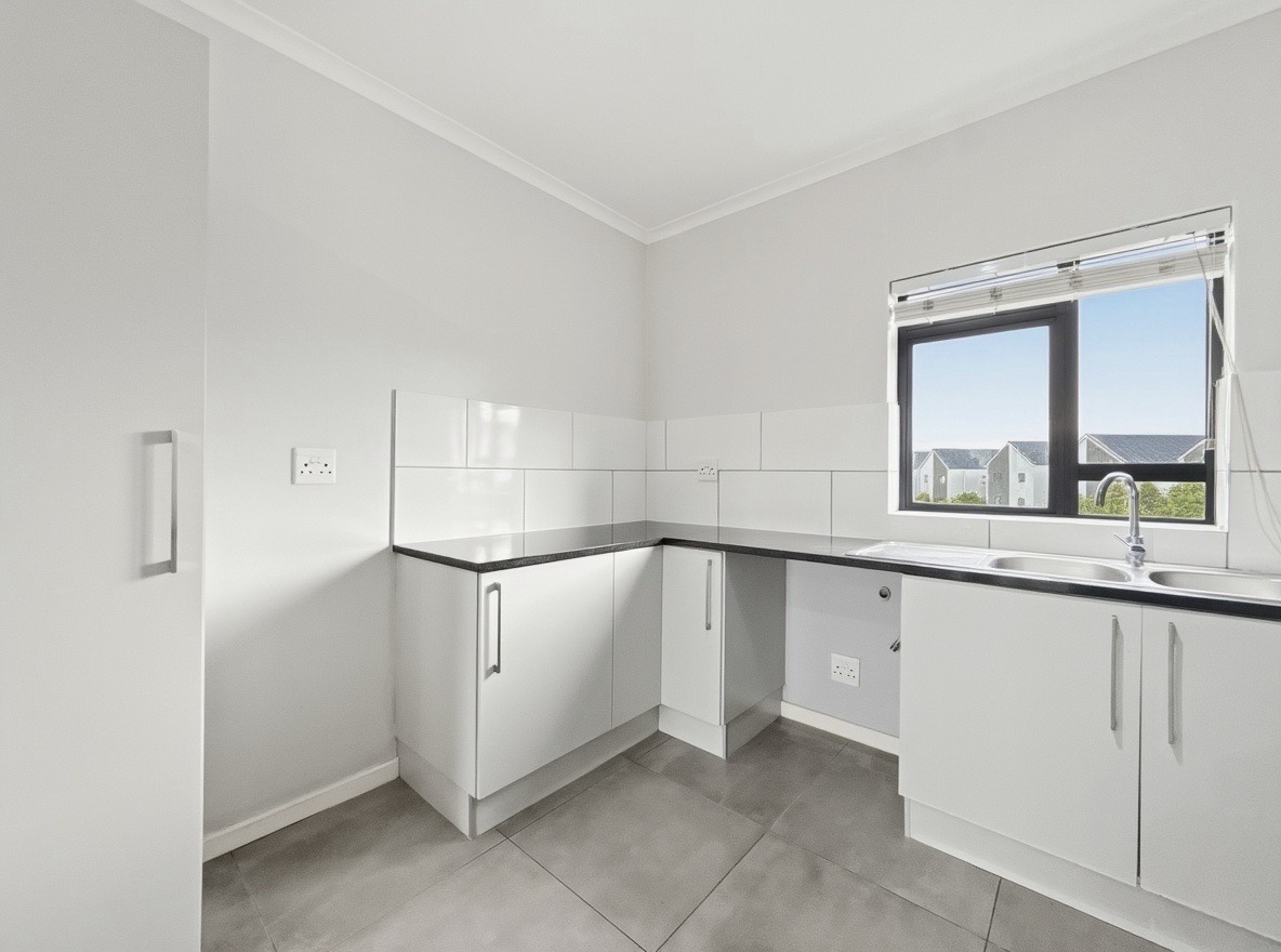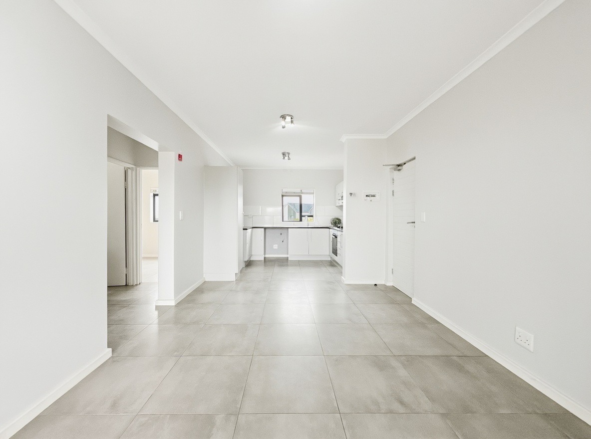 The apartment includes two bedrooms, both with built-in cupboards, and one bathroom with a shower over a bath, basin, and toilet. The kitchen and living area are open plan. The kitchen is fitted with a gas hob, electric oven, and one plumbing point suitable for a washing machine or dishwasher. The living area opens onto a balcony with a built-in braai.