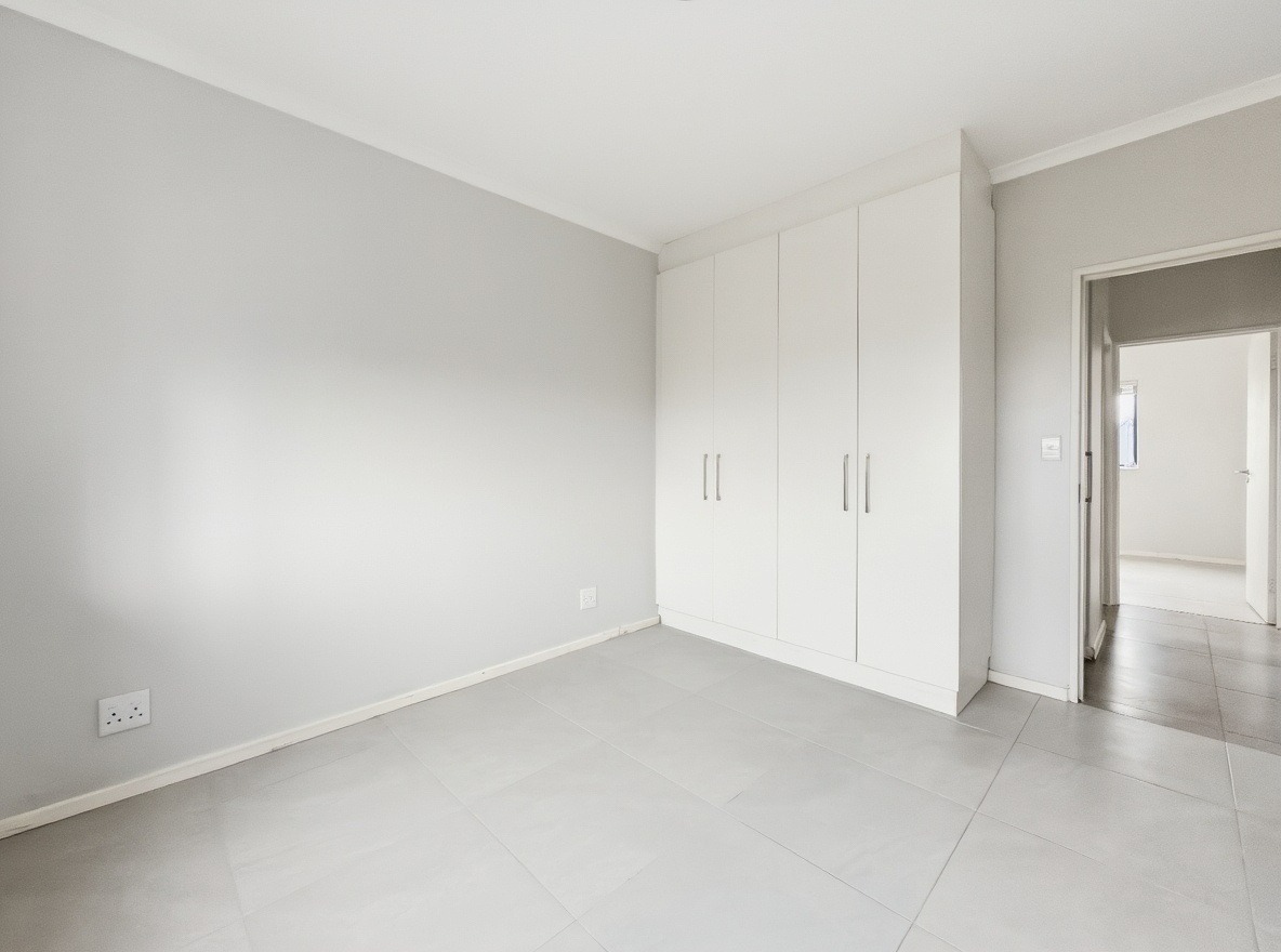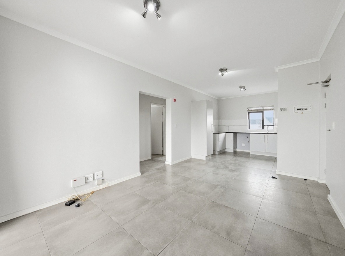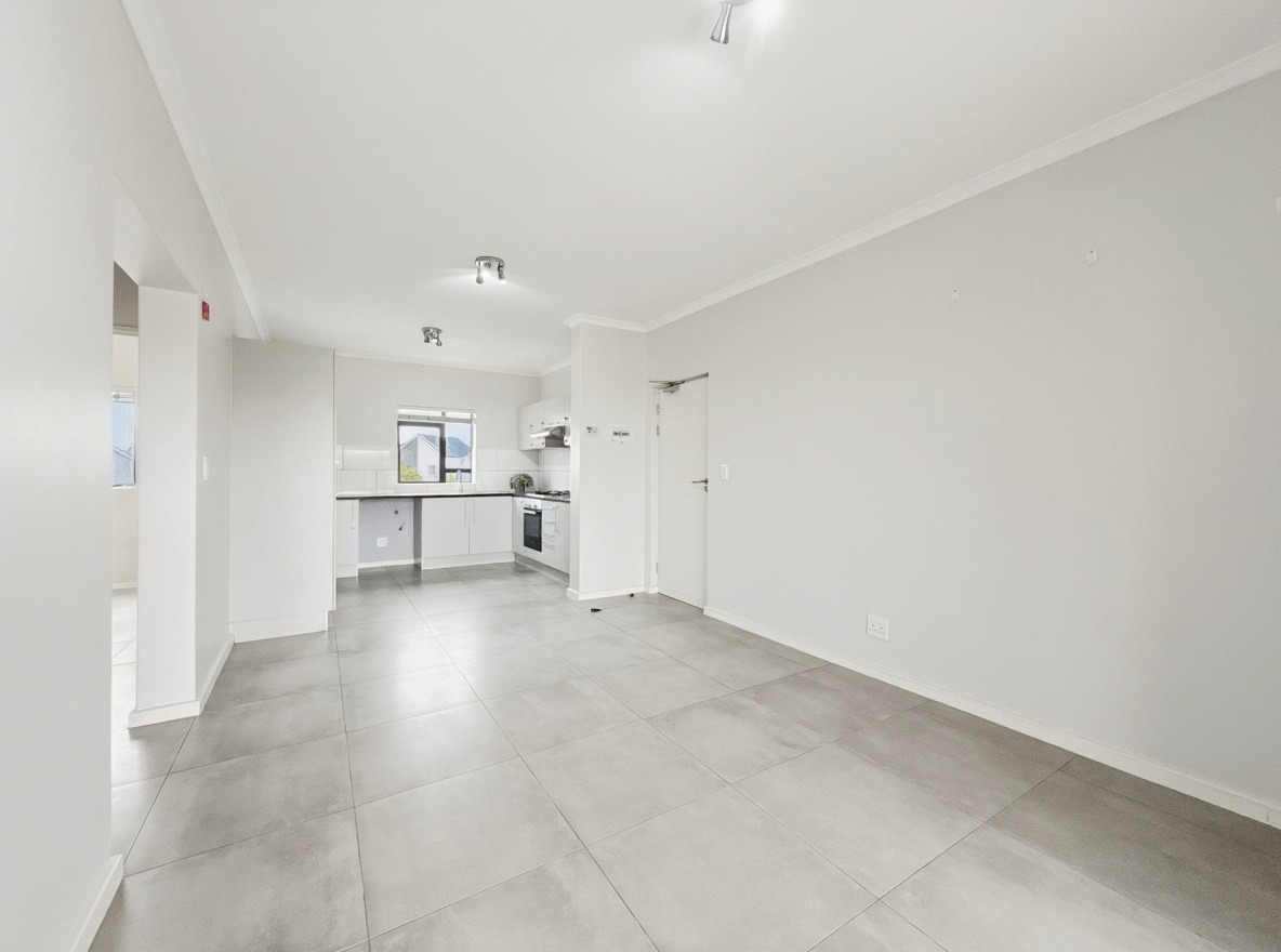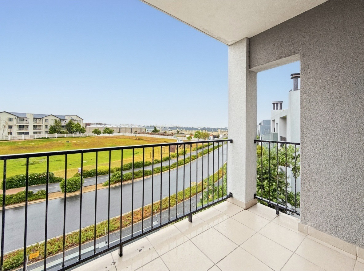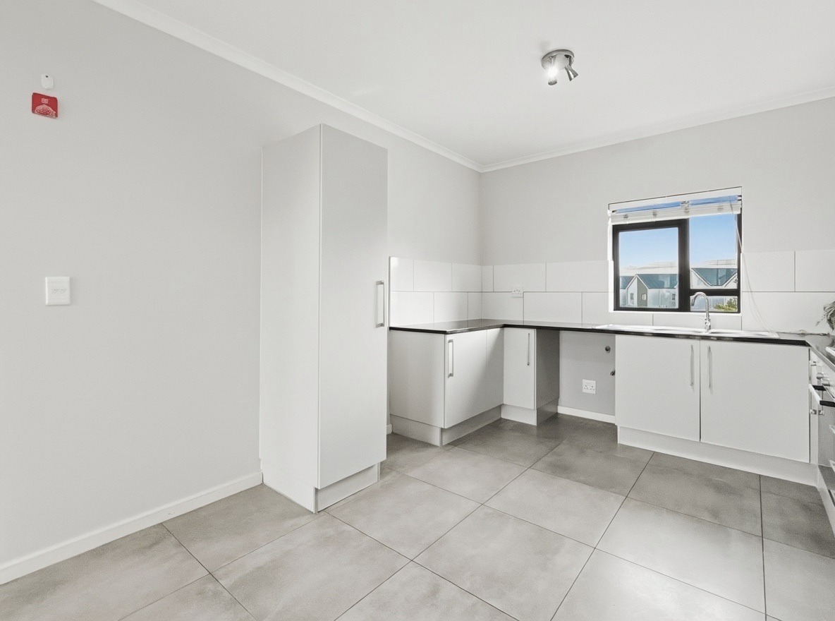 The apartment includes two bedrooms, both with built-in cupboards, and one bathroom with a shower over a bath, basin, and toilet. The kitchen and living area are open plan. The kitchen is fitted with a gas hob, electric oven, and one plumbing point suitable for a washing machine or dishwasher. The living area opens onto a balcony with a built-in braai.